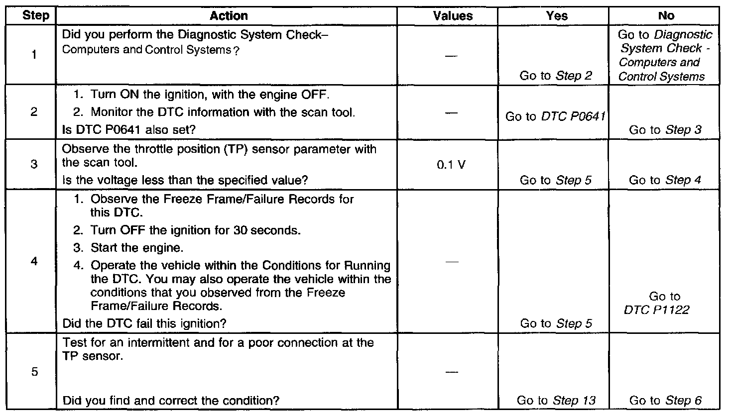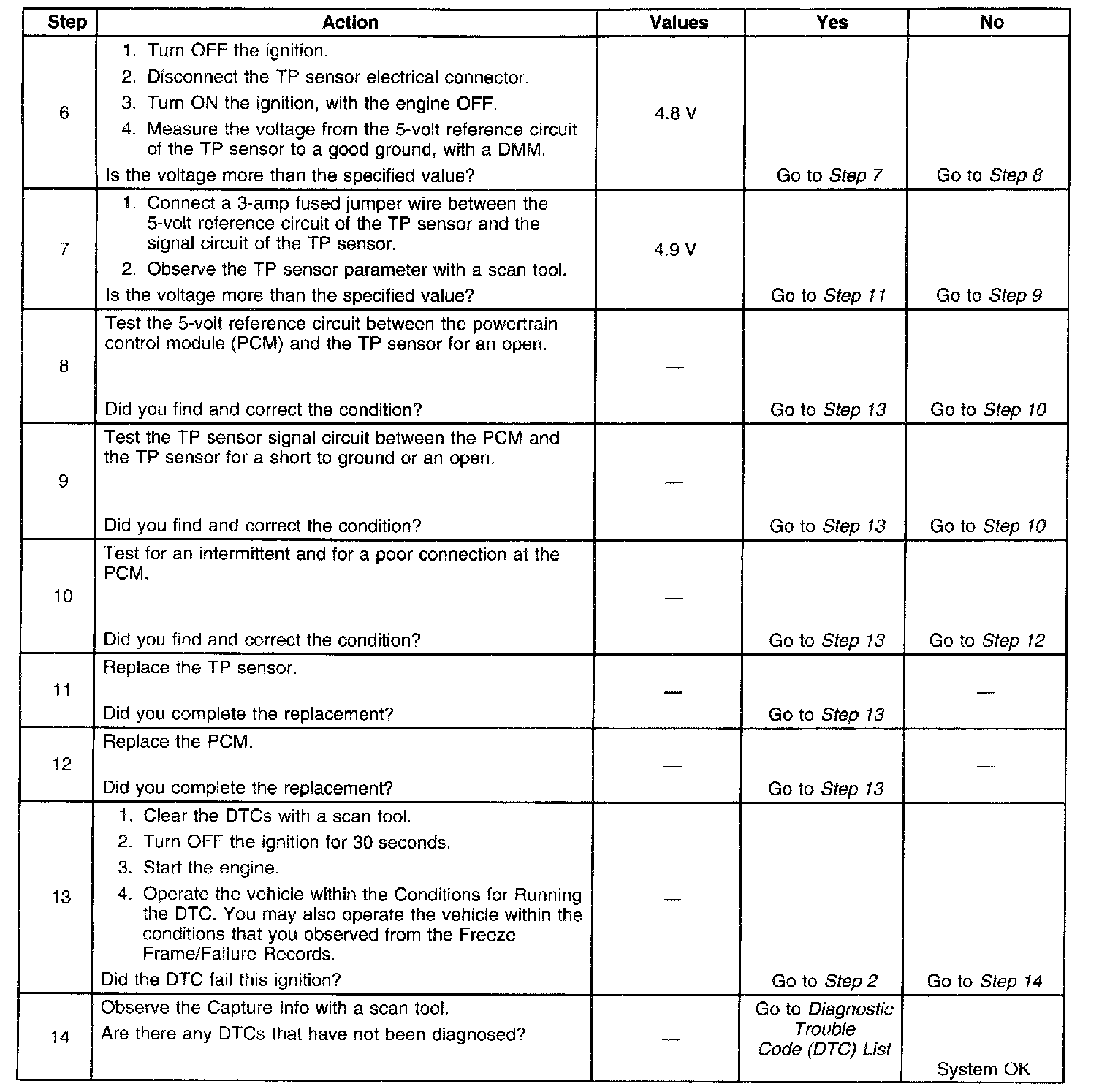 The PCM provides the TP sensor with 5 volts on the 5-volt reference circuit and a ground on the low reference circuit. Rotation of the TP sensor rotor from the closed throttle position to the wide open throttle (WOT) position provides the PCM with a signal voltage from less than 1.0 volt to greater than 4.0 volts through the TP sensor signal circuit. If the PCM detects an excessively low signal voltage, DTC P0122 sets.