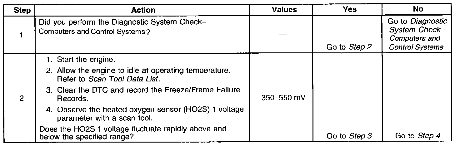 The PCM detects that the HO2S 1 signal voltage remains between 382-525 mV for more than 30 seconds.
