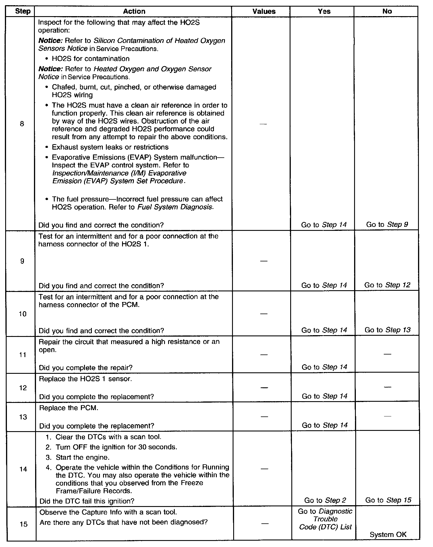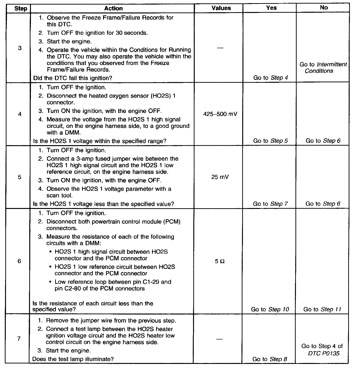 Heated oxygen sensors (HO2S) are used for fuel control and post catalyst monitoring. Each HO2S compares the oxygen content of the surrounding air with the oxygen content of the exhaust stream. When the vehicle is first started, the powertrain control module (PCM) operates in an Open Loop mode, ignoring the HO2S signal voltage when calculating the air-to-fuel ratio. The PCM supplies the HO2S with a reference, or bias, voltage of about 450 mV. The HO2S generates a voltage within a range of 0-1,000 mV that fluctuates above and below bias voltage once in Closed Loop. A high HO2S voltage output indicates a rich fuel mixture. A low HO2S voltage output indicates a lean mixture. Heating elements inside the HO2S minimize the time required for the sensors to reach operating temperature, and to provide an accurate voltage signal. If the PCM detects that the HO2S 1 voltage remains at or near the bias voltage amount, DTC P0134 will set. The HO2S 1 has the following circuits:
