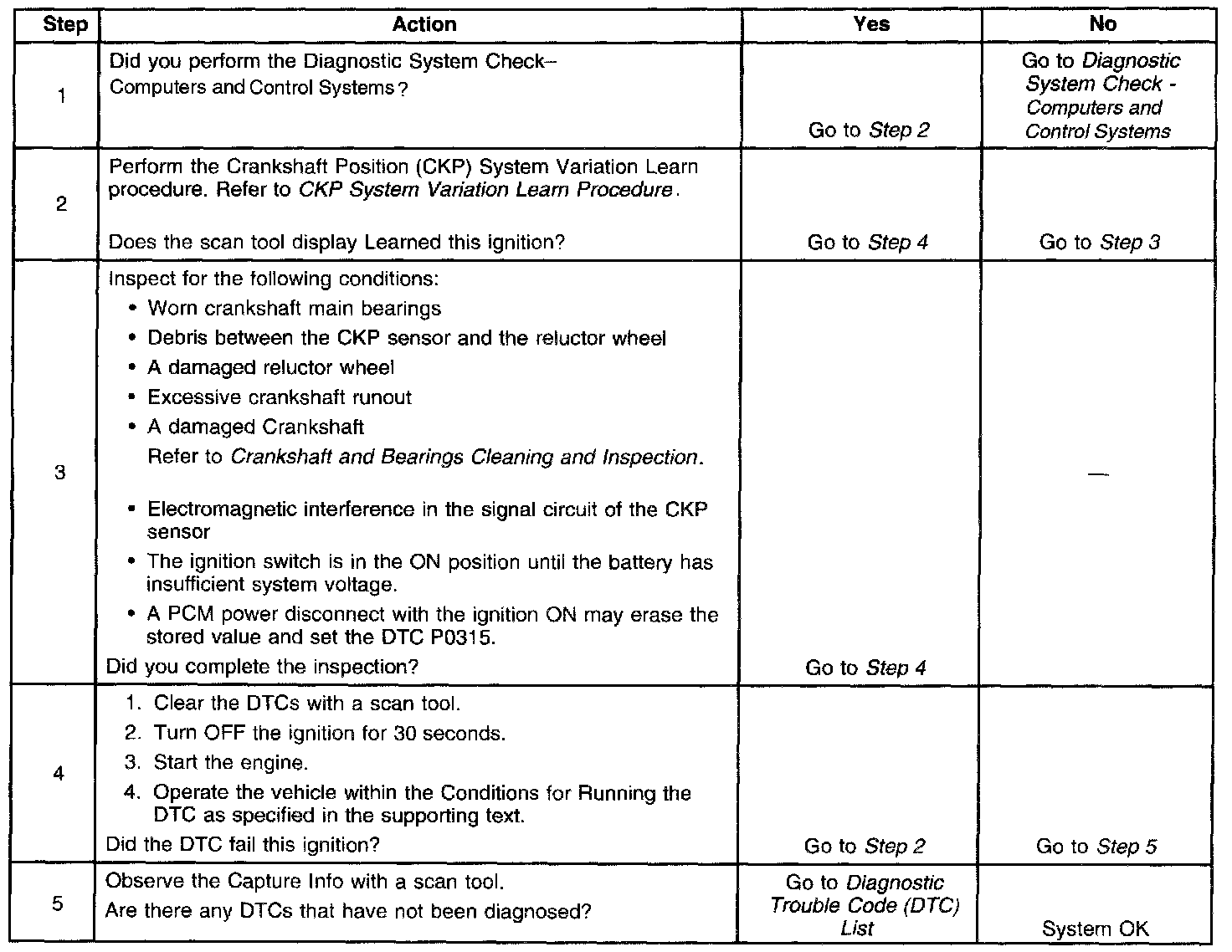 The CKP system variation compensating values are stored in PCM memory after a learn procedure has been performed. If the actual CKP variation is not within the CKP system variation compensating values stored in the PCM, DTC P0300 may set. If the CKP system variation values are not stored in the PCM memory, DTC P0315 sets.