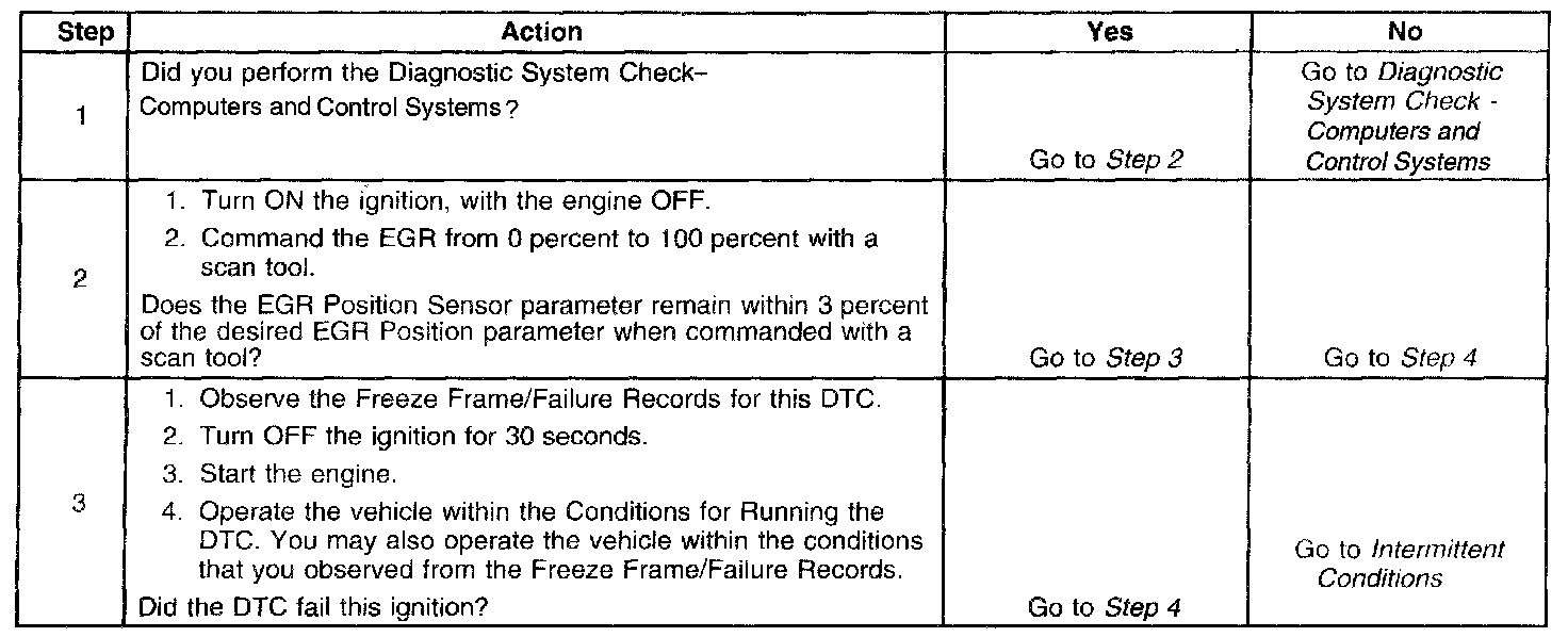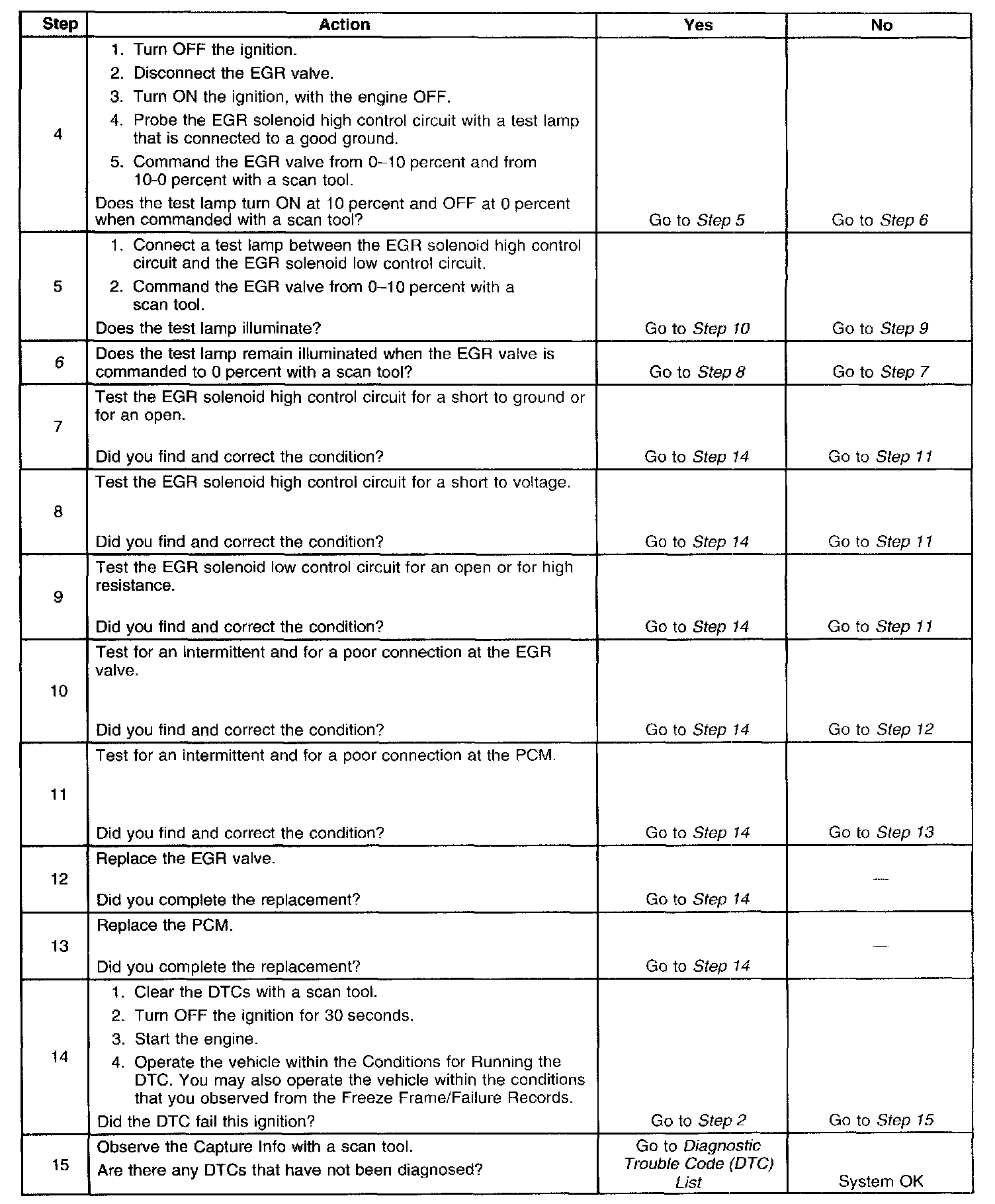 The powertrain control module (PCM) controls the exhaust gas recirculation (EGR) valve with a solid state device called a driver. The driver supplies the EGR solenoid with 12 volts that is pulse width modulated (PWM) through the EGR solenoid high control circuit. A ground path is provided by the PCM through the EGR solenoid low control circuit. The driver has the ability to detect an electrical malfunction on the EGR solenoid control circuits. If the PCM determines that the driver has detected an electrical malfunction on one of these circuits, DTC P0403 sets.