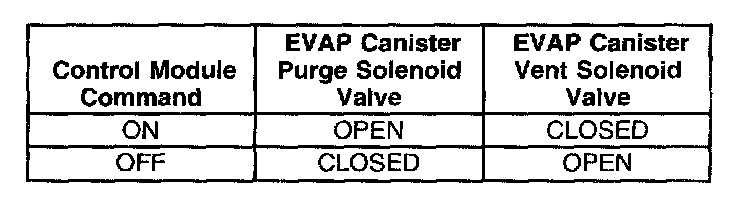The table illustrates the relationship between the ON and OFF states, and the OPEN or CLOSED states of the EVAP canister purge and vent solenoid valves.