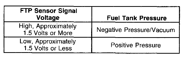The table illustrates the relationship between the FTP sensor signal voltage and the EVAP system pressure/vacuum.