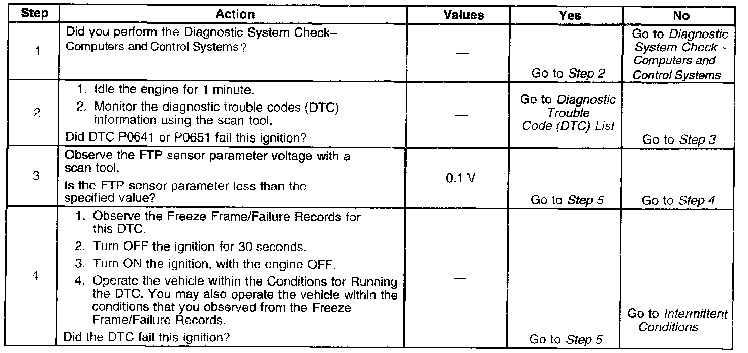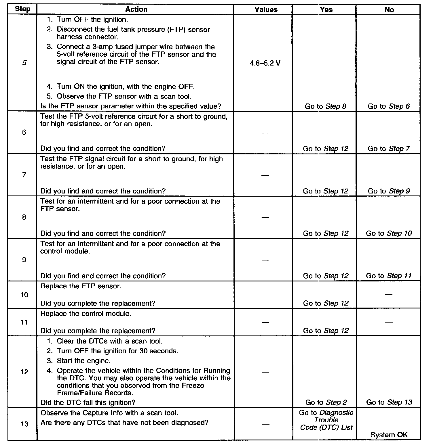 The fuel tank pressure (FTP) sensor measures the difference between the air pressure or vacuum in the evaporative emission (EVAP) system, and the outside air pressure. The control module supplies a 5-volt reference and a low reference circuit to the FTP sensor. The FTP sensor signal circuit voltage varies depending on EVAP system pressure or vacuum. If the FTP sensor signal voltage goes below a calibrated value, this DTC sets.