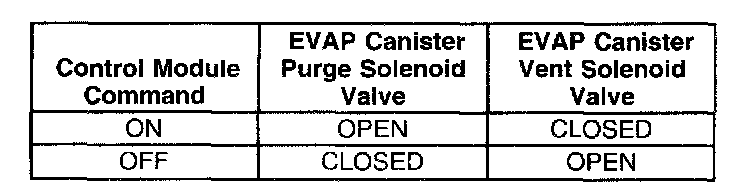 The table illustrates the relationship between the ON and OFF states, and the OPEN or CLOSED states of the EVAP canister purge and vent solenoid valves.