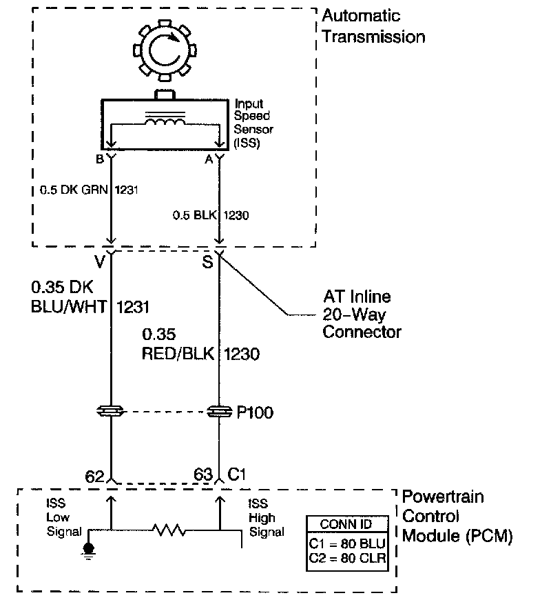 The automatic transmission Input Speed Sensor (ISS) provides transmission input speed to the Powertrain Control Module (PCM). The ISS is a permanent magnet generator. The sensor mounts into the transmission case and maintains a slight air gap between the sensor and the drive sprocket. The ISS produces an AC voltage as the drive sprocket rotor teeth pass through the magnetic field of the sensor. The AC voltage level increases as the turbine shaft speed increases. The PCM converts the AC voltage into a digital signal. The PCM determines actual turbine speed using the digital signal. The PCM uses the input speed to calculate torque converter slip speed, and gear ratios.
