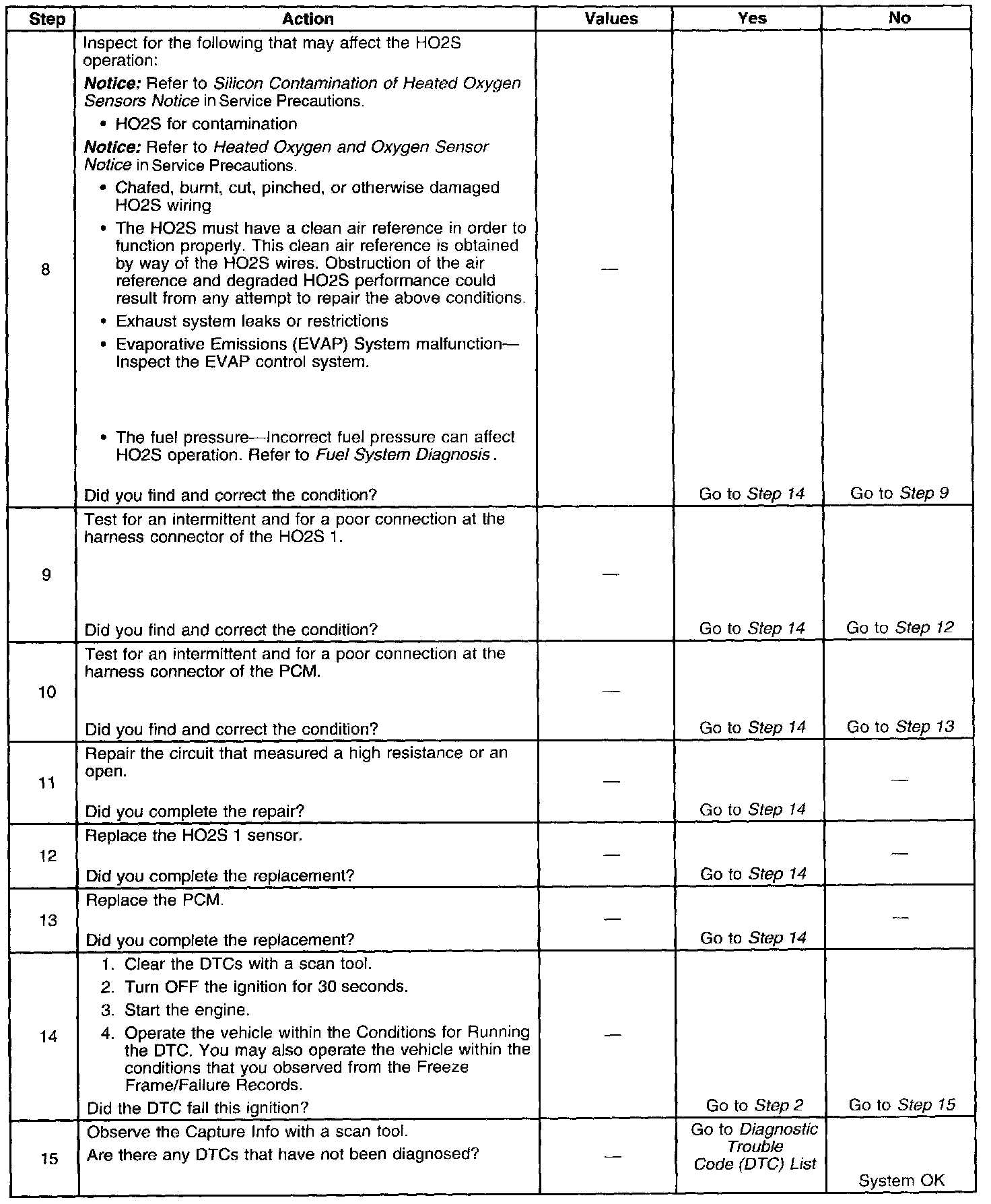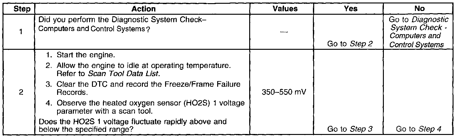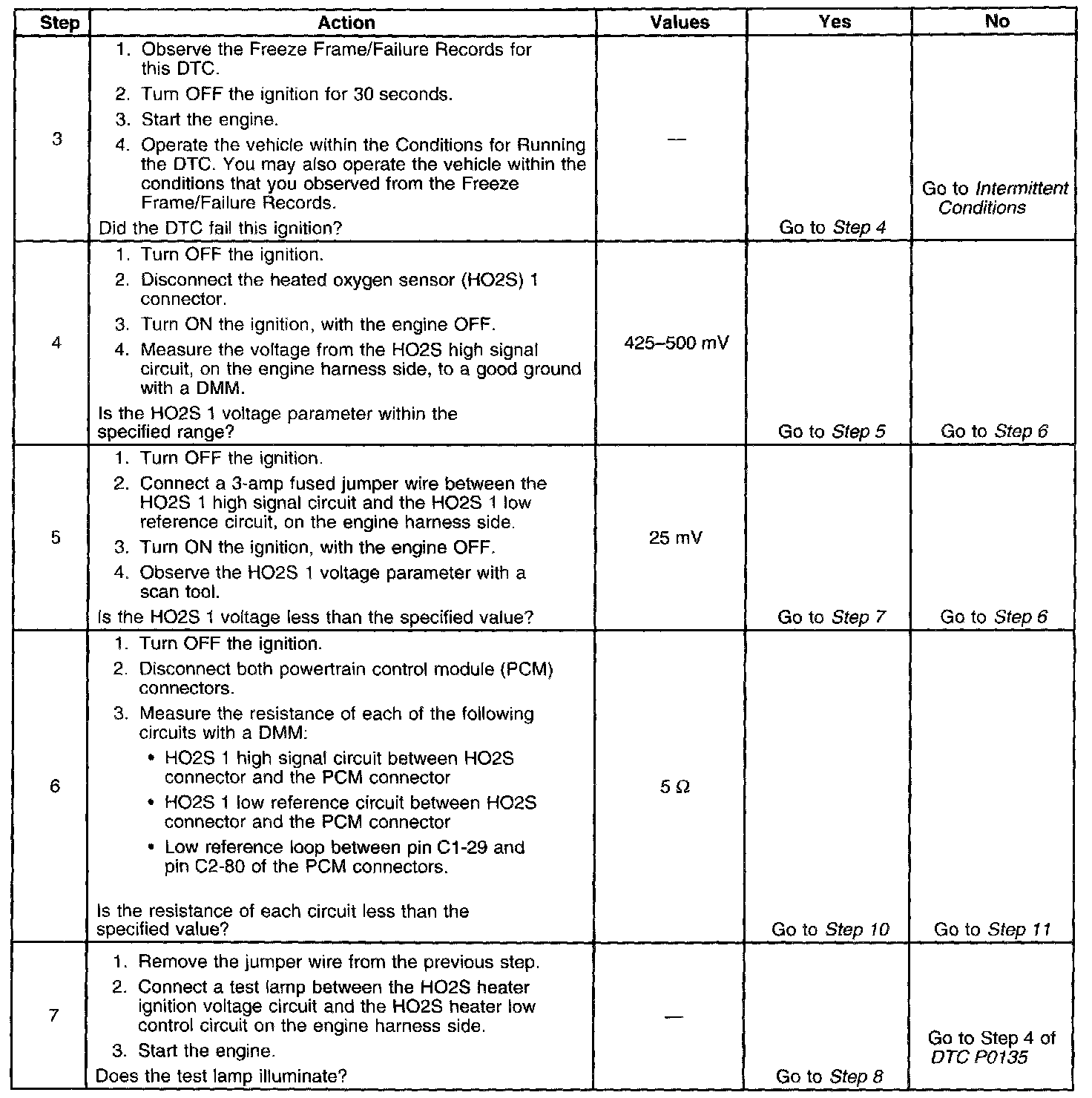 Heated oxygen sensors (HO2S) are used for fuel control and post catalyst monitoring. Each HO2S compares the oxygen content of the surrounding air with the oxygen content of the exhaust stream. When the vehicle is first started, the powertrain control module (PCM) operates in an Open Loop mode, ignoring the HO2S signal voltage when calculating the air-to-fuel ratio. The PCM supplies the HO2S with a reference, or bias, voltage of about 450 mV. The HO2S generates a voltage within a range of 0-1,000 mV that fluctuates above and below bias voltage once in Closed Loop. A high HO2S voltage output indicates a rich fuel mixture. A low HO2S voltage output indicates a lean mixture. Heating elements inside the HO2S minimize the time required for the sensors to reach operating temperature, and to provide an accurate voltage signal. If the PCM detects that the HO2S 1 voltage did not switch above 598 mV and below 299 mV enough times during a calibrated time period, DTC P1133 will set. The HO2S 1 has the following circuits: