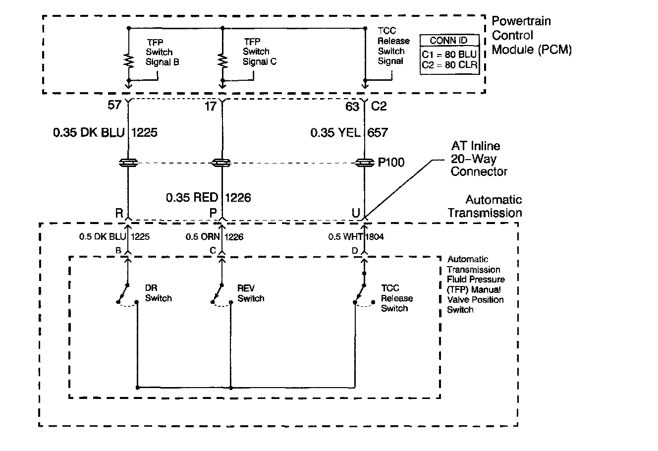 The automatic Transmission Fluid Pressure (TFP) manual valve position switch consists of three pressure switches. Two of the switches are normally-open, and determine gear range selection. The third switch is normally-closed, and detects Torque Converter Clutch (TCC) release fluid pressure. The TFP manual valve position switch also contains the automatic Transmission Fluid Temperature (TFT)sensor. These components are combined into one unit, attached to the control valve body.