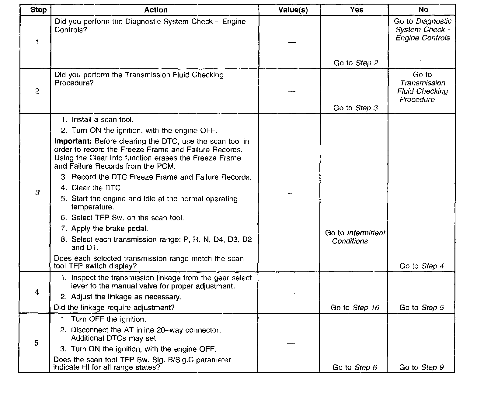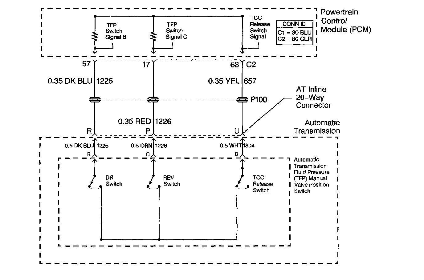 The automatic Transmission Fluid Pressure (TFP) manual valve position switch consists of three pressure switches. Two of the switches are normally-open, and determine gear range selection. The third switch is normally-closed, and detects Torque Converter Clutch (TCC) release fluid pressure. The TFP manual valve position switch also contains the automatic Transmission Fluid Temperature (TFT)sensor. These components are combined into one unit, attached to the control valve body.