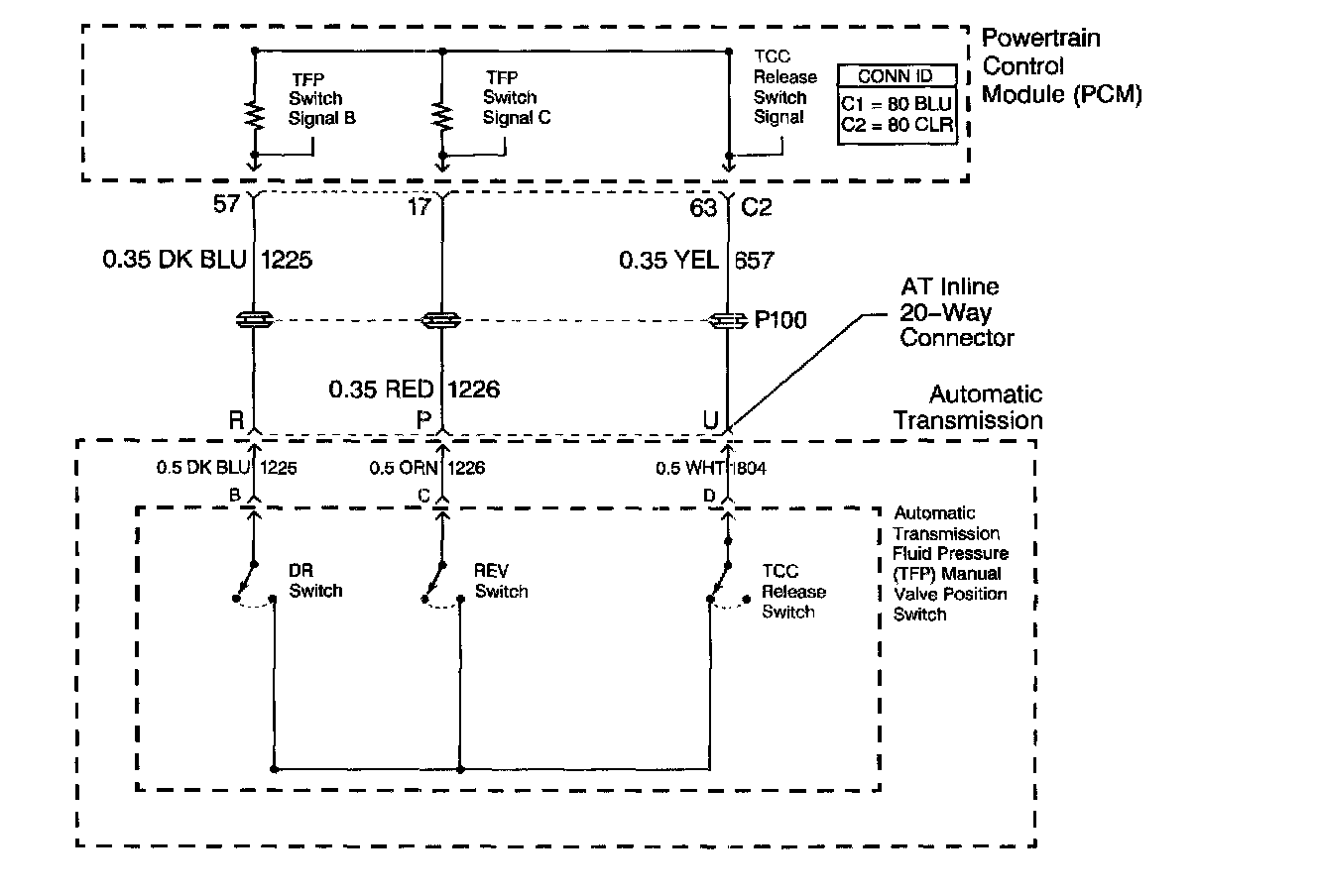 The Torque Converter Clutch (TCC) release switch is part of the automatic Transmission Fluid Pressure (TFP) manual valve position switch. The TFP manual valve position switch is attached to the control valve body. The TCC release switch is normally-closed.