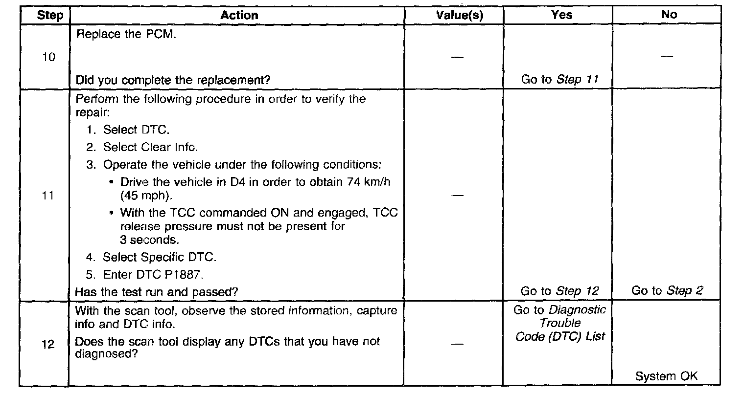 When the PCM determines that the TCC release switch is open, indicating that the TCC is not applied, and the TCC slip speed indicates that the TCC is applied, then DTC P1887 sets. DTC P1887 is a type B DTC.