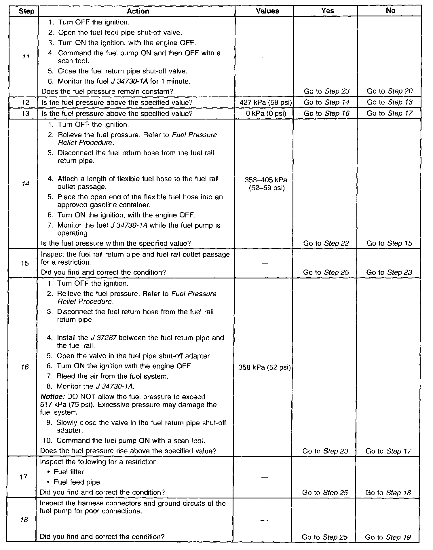 14. This step tests for a restricted fuel return pipe. If the fuel pressure is within the specified values, a restriction in the fuel return pipe is indicated.