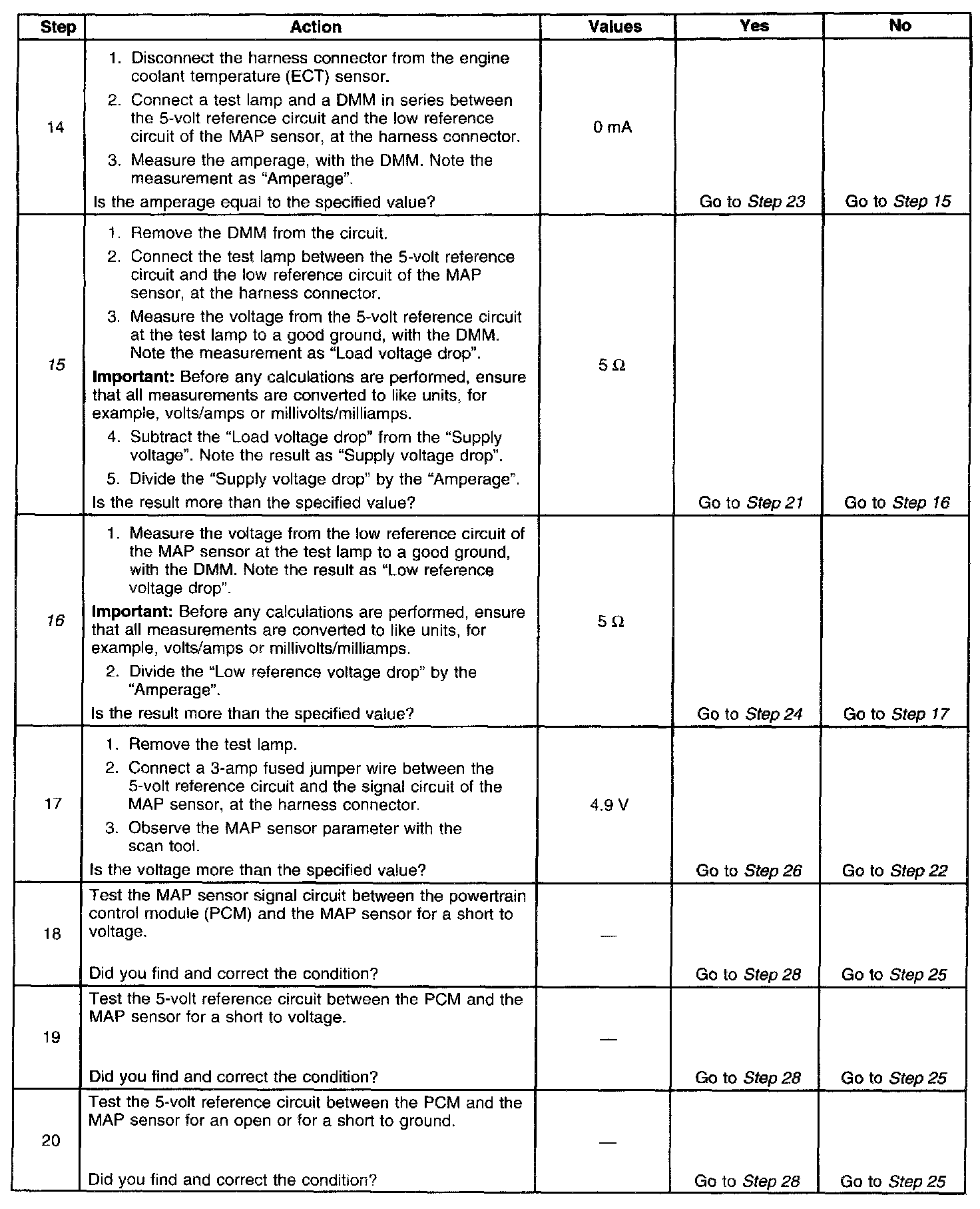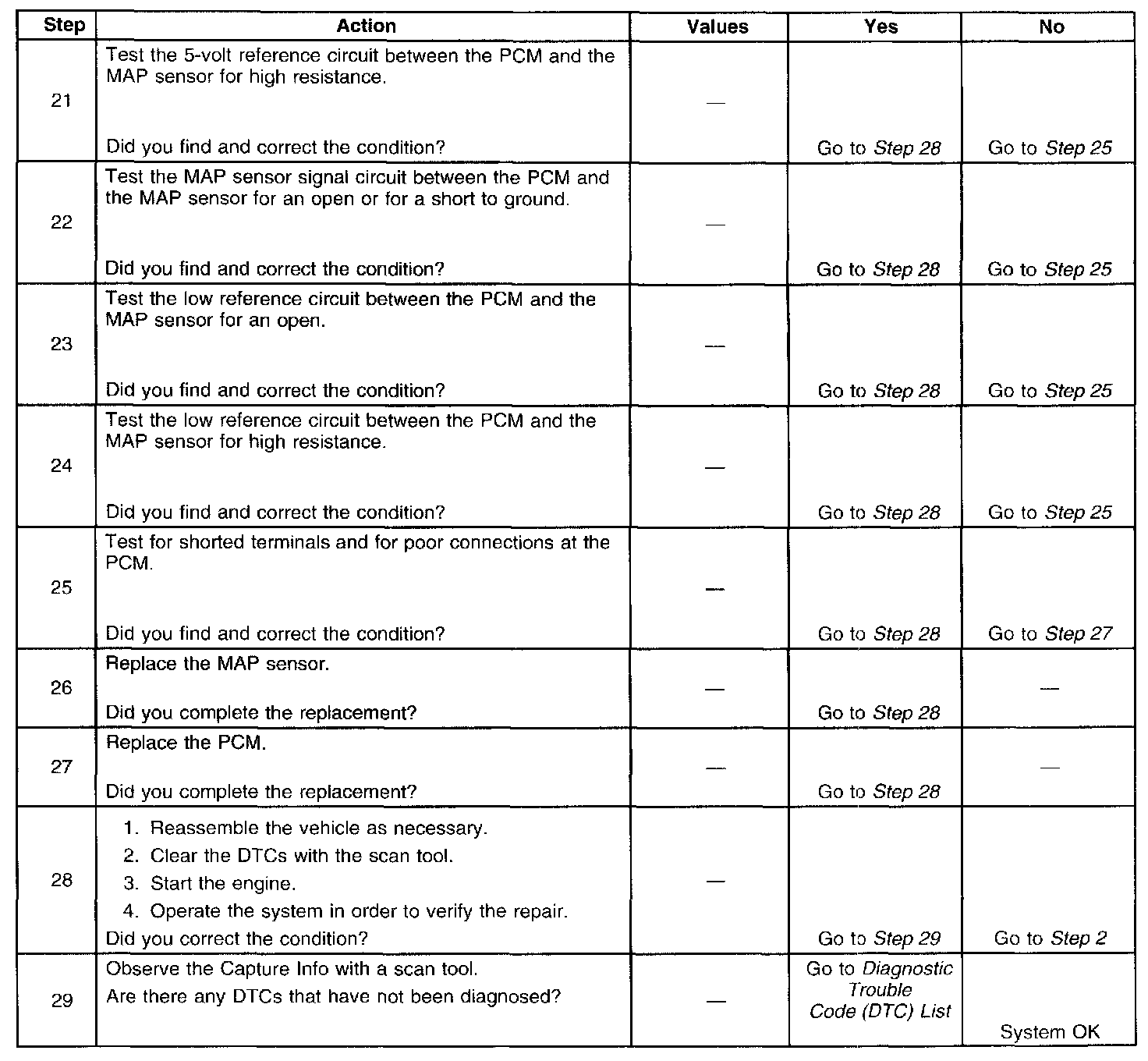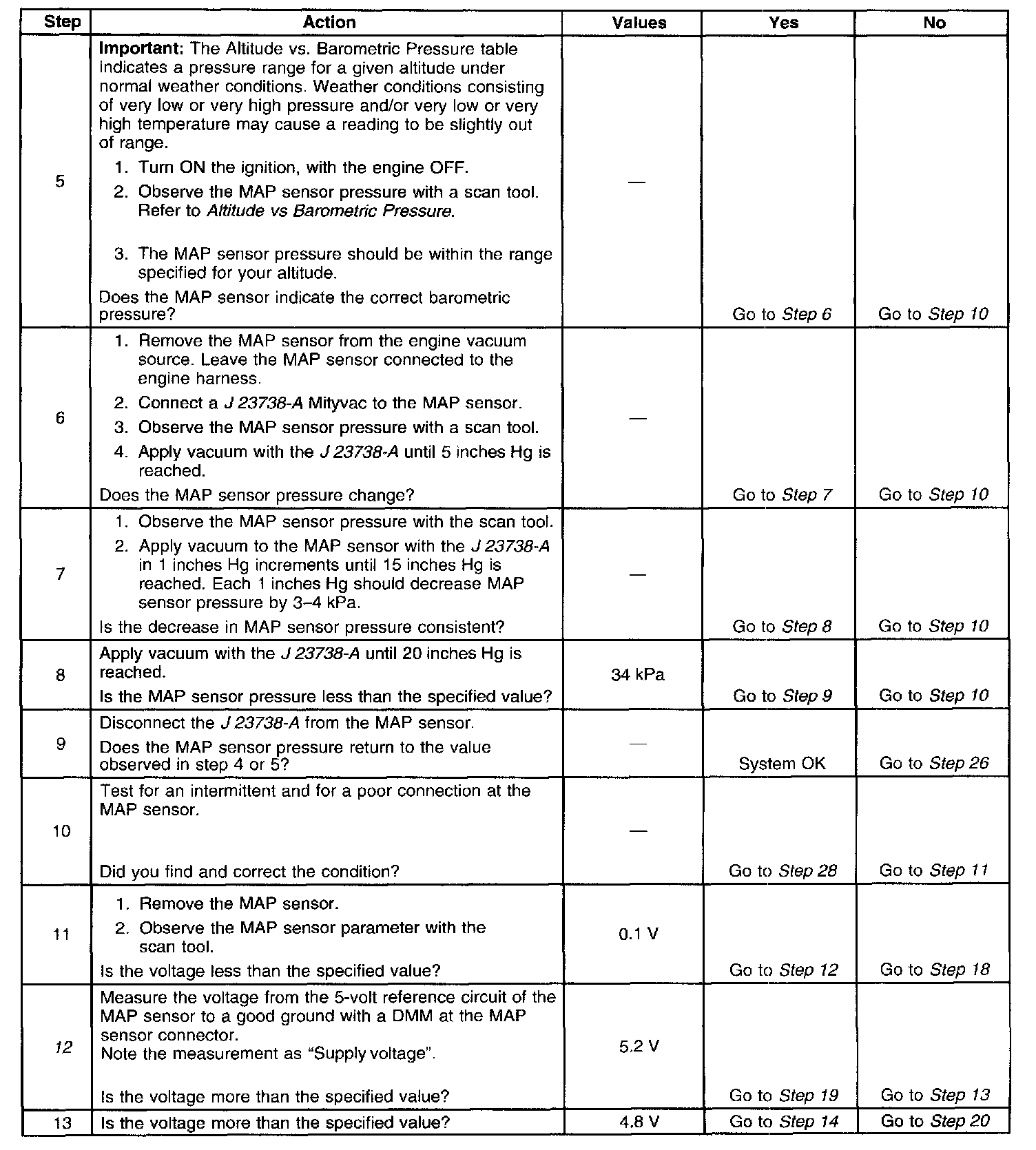 The manifold absolute pressure (MAP) sensor responds to changes in intake manifold pressure which gives an indication of the engine load. The MAP sensor has a 5-volt reference circuit, a low reference circuit, and a signal circuit. The powertrain control module (PCM) supplies 5 volts to the MAP sensor on the 5-volt reference circuit and provides a ground on the low reference circuit. The MAP sensor provides a signal to the PCM on the MAP sensor signal circuit, which is relative to the pressure changes in the manifold. With low MAP, such as during idle or deceleration, the PCM should detect a low MAP sensor signal voltage. With high MAP, such as ignition ON, engine OFF or wide open throttle (WOT), the PCM should detect a high MAP sensor signal voltage. The MAP sensor is also used in order to calculate the barometric pressure (BARO) when the ignition switch is turned ON, with the engine OFF. The BARO reading may also be updated whenever the engine is operated at WOT. The PCM monitors the MAP sensor signal for voltage outside of the normal range. If the PCM detects a MAP sensor signal voltage that is excessively low, DTC P0107 sets. If the PCM detects a MAP sensor signal voltage that is excessively high DTC P0108 sets.