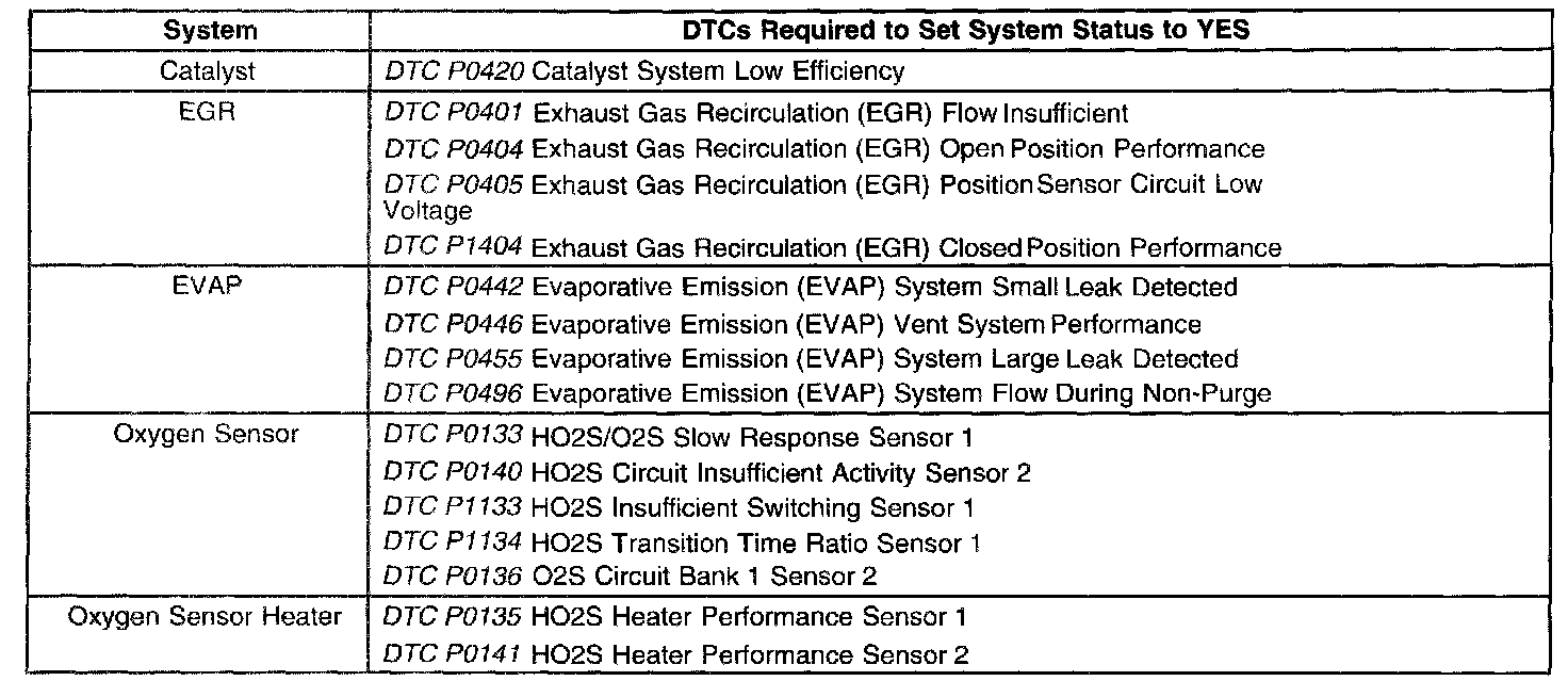INSPECTION/MAINTENANCE (I/M) SYSTEM DTC TABLEIMPORTANT: Not all vehicles will have every diagnostic trouble code (DTC) listed in each section For example, a vehicle may have only 2 oxygen sensors or 1 catalyst Only those DTCs applicable to the vehicle are required to update each System Status to YES. Refer to the appropriate service manual to determine which DTCs are supported for each vehicle.