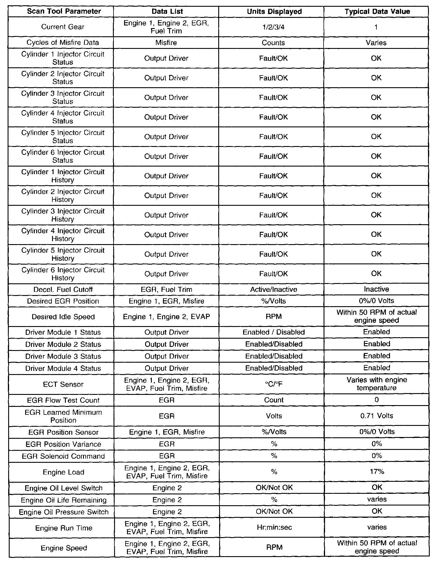 - Engine Data 1-Contains general information regarding fuel delivery, idle air control (IAC) position, heated oxygen sensor (HO2S1), HO2S2, and other basic engine operating conditions.