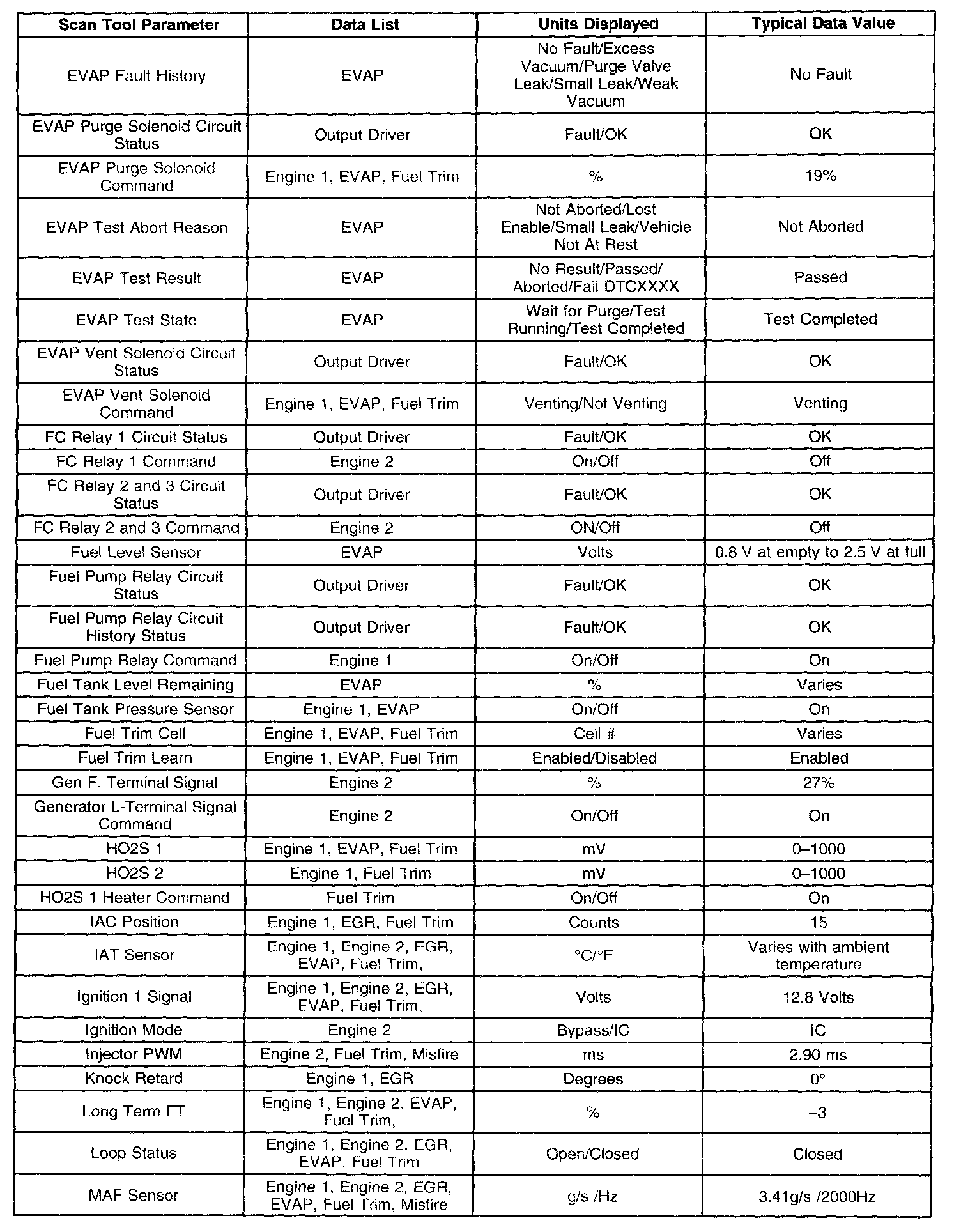 - Engine Data 2-Contains general information regarding engine coolant temperature (ECT), intake air temperature (IAT), mass air flow (MAF), manifold absolute pressure (MAP), and other basic engine operating conditions.