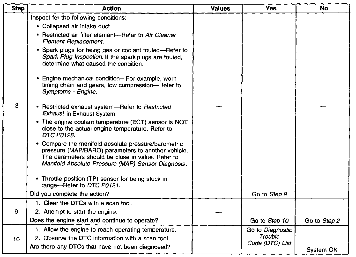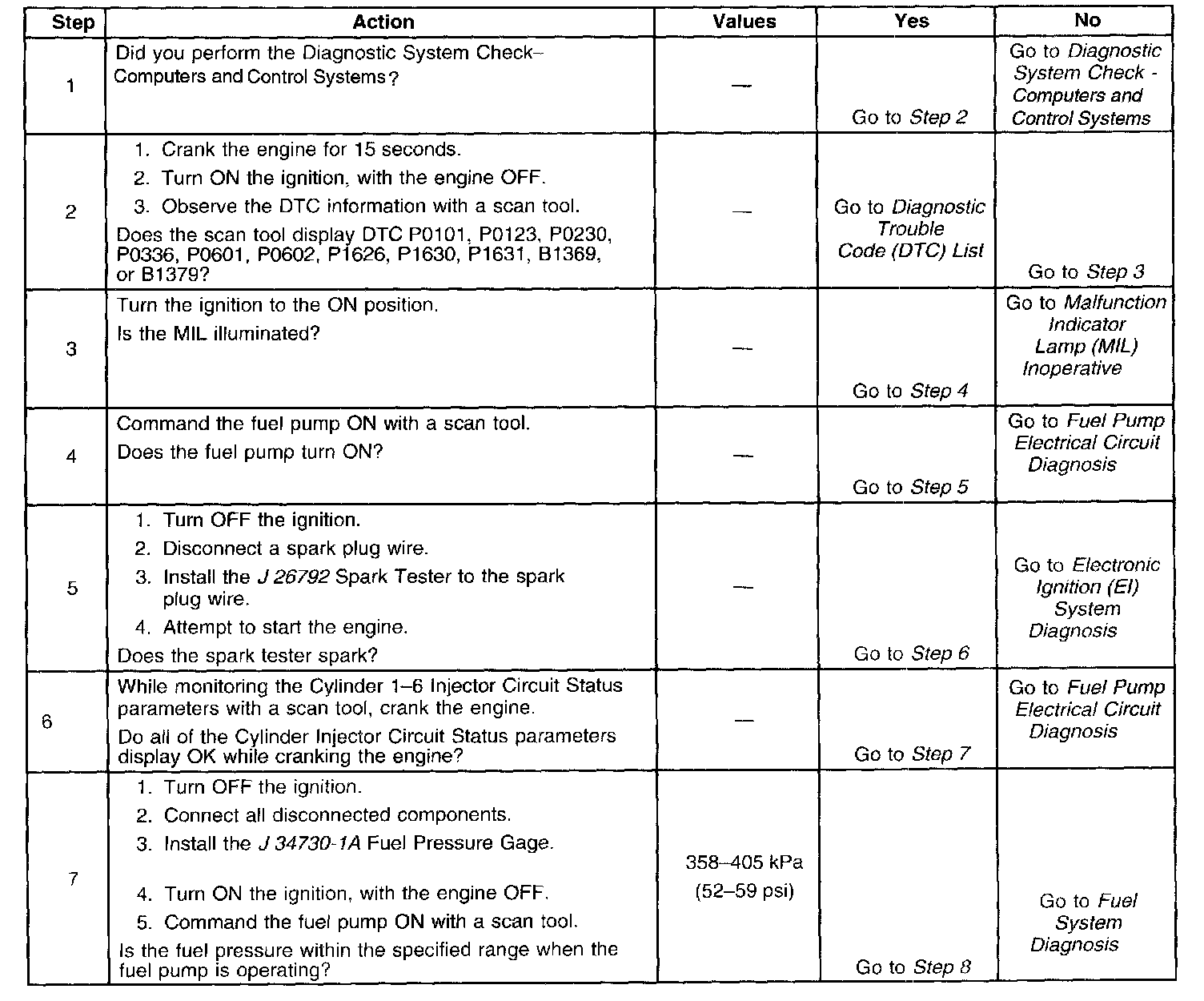 The Engine Cranks but Does Not Run diagnostic table assumes the following: