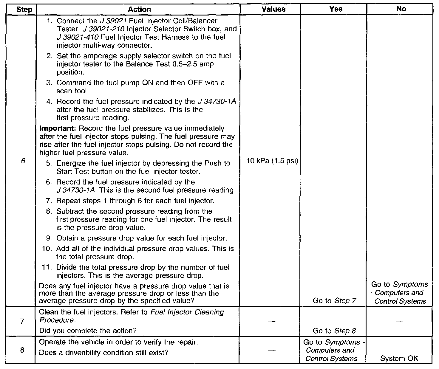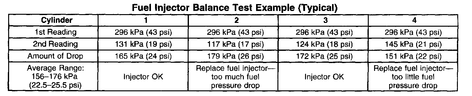 6. If the pressure drop value for each fuel injector is within 10 kPa (1.5 psi) of the average pressure drop value, the fuel injectors are flowing properly.