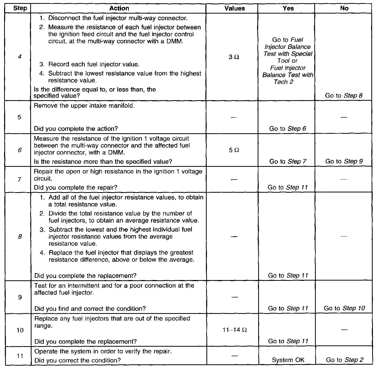 4. This step determines if all of the fuel injectors are within 3 ohms of each other. If the highest resistance value is within 3 ohms of the lowest resistance value, then all of the fuel injector coil windings are OK.