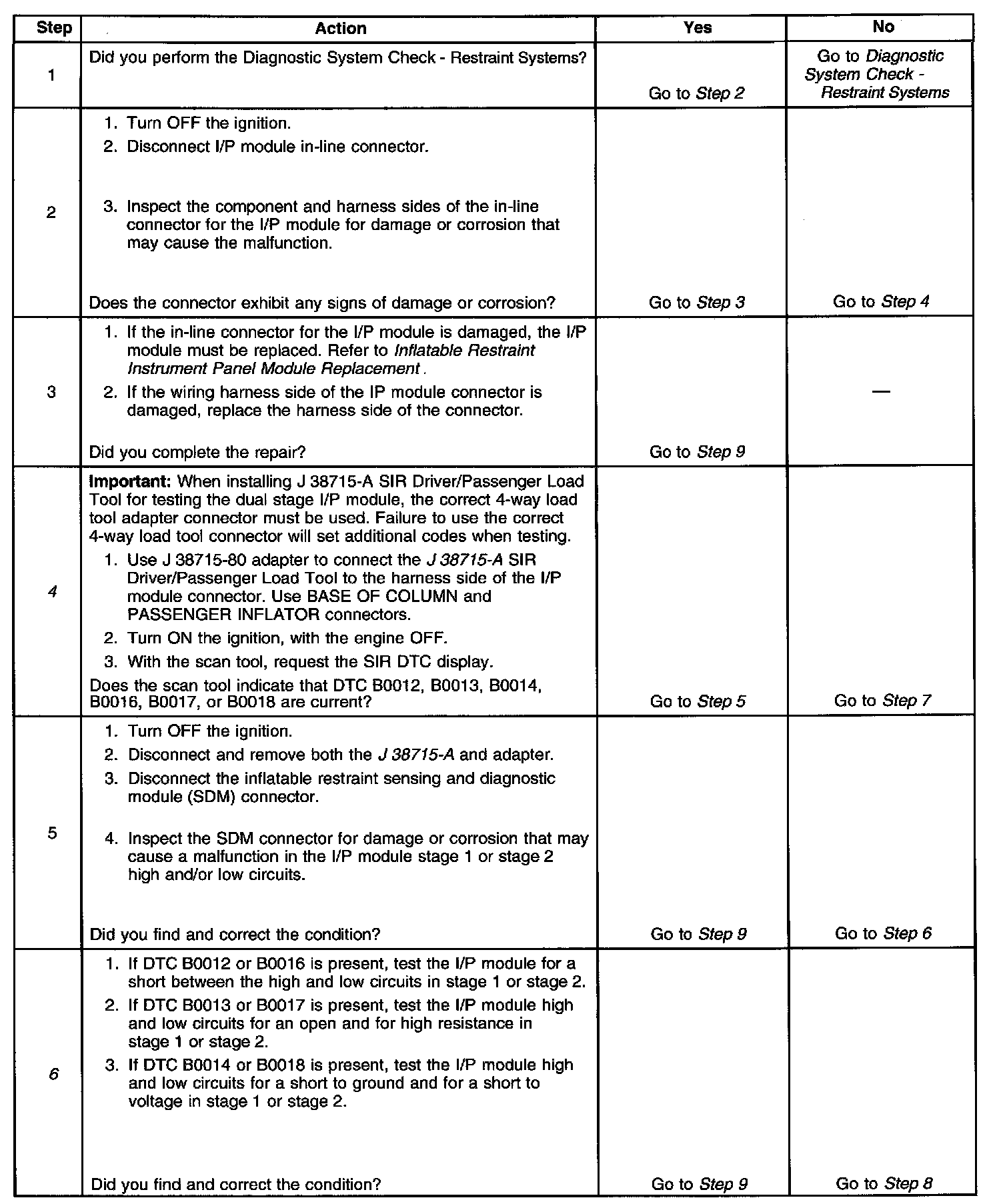 6. Tests to see what DTCs are present. If DTC B0012 or B0016 is present, test the I/P module for a short between high and low circuits in stage 1 or stage 2. If DTC B0013 or B0017 is present, test the I/P module high and low circuits for an open and for high resistance in stage 1 or stage 2. If DTC B0014 or B0018 is present, test the I/P module high and low circuits for a short to ground and for a short to voltage in stage 1 or stage 2.