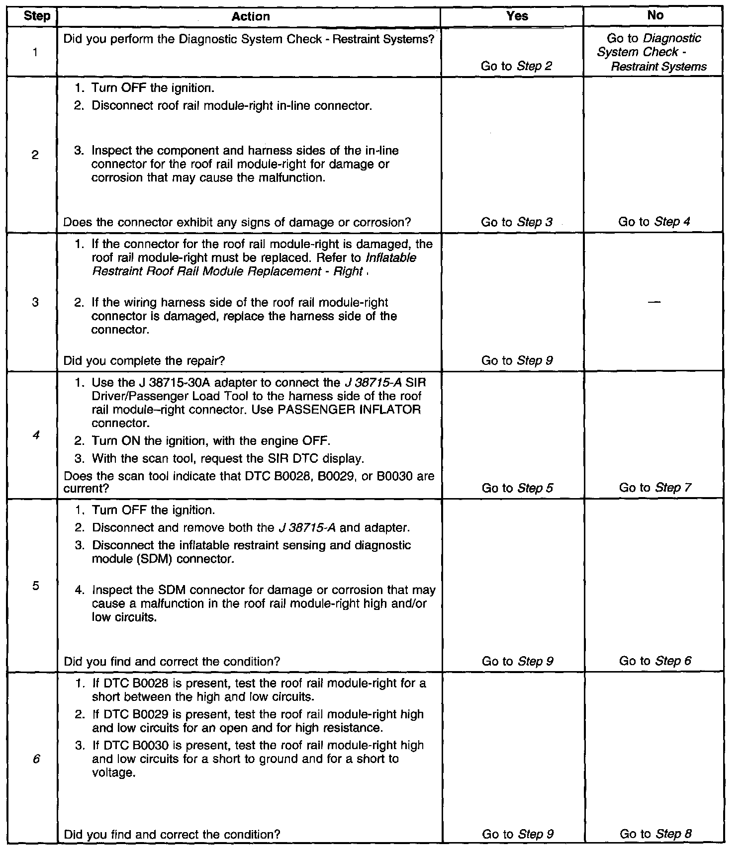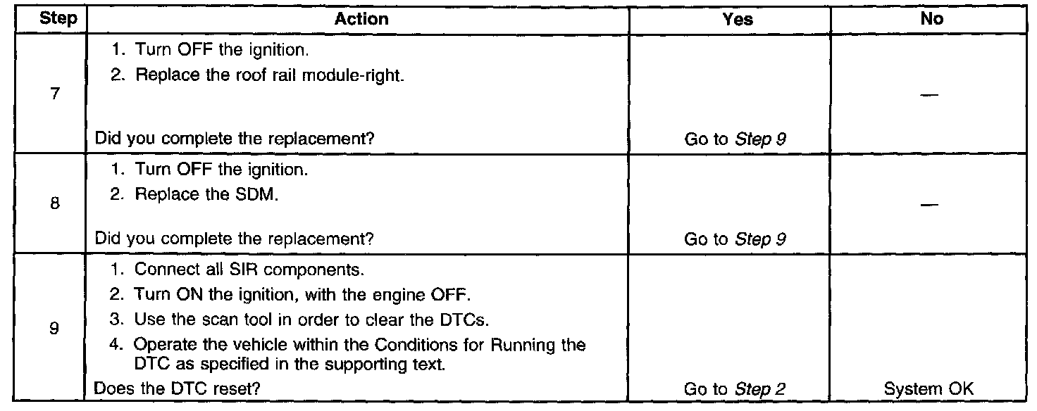 The passenger roof rail deployment loop consists of an inflatable restraint roof rail module-right, the roof rail module-right high and roof rail module-right low circuits. A shorting bar used within the roof rail module connector which will short together both roof rail module-right high and low circuits when the connector is disconnected, this will help to prevent unwanted deployment of the inflator module during servicing. During a side or frontal crash of sufficient force the inflatable restraint sensing and diagnostic module (SDM) will allow current to flow through the deployment loop in order to deploy the roof side rail module. The SDM performs continuous diagnostic tests on the deployment loops to check for proper circuit continuity and for shorts to ground or voltage. If a malfunction is detected, a diagnostic trouble code (DTC) will be stored in memory.