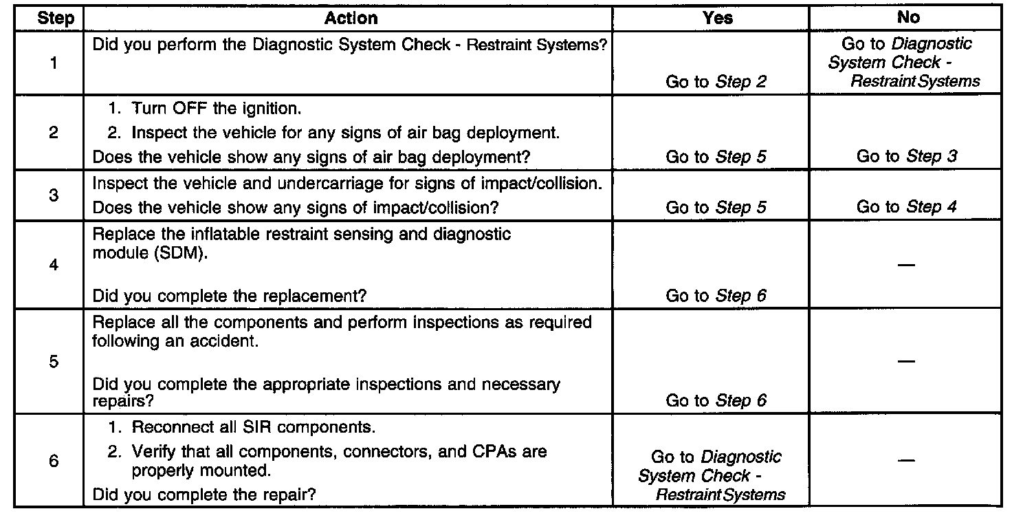 The Inflatable Restraint Sensing and Diagnostic Module (SDM) contains a sensing device that converts vehicle velocity and convert this to a electrical signal. The SDM processes the generated electrical signal and compares the signal to a value stored in memory. If the generated signal exceeds the stored value, the SDM performs additional signal processing and compares the generated signals to signals stored in memory. When two of the generated signals exceed the stored values, the SDM will cause current to flow through the inflator modules, deploying the air bags. DTC B0053 will set instead of a DTC B0051 when a deployment occurs while an inflator circuit fault is present that may result in a non-deployment situation in one or more inflator modules.