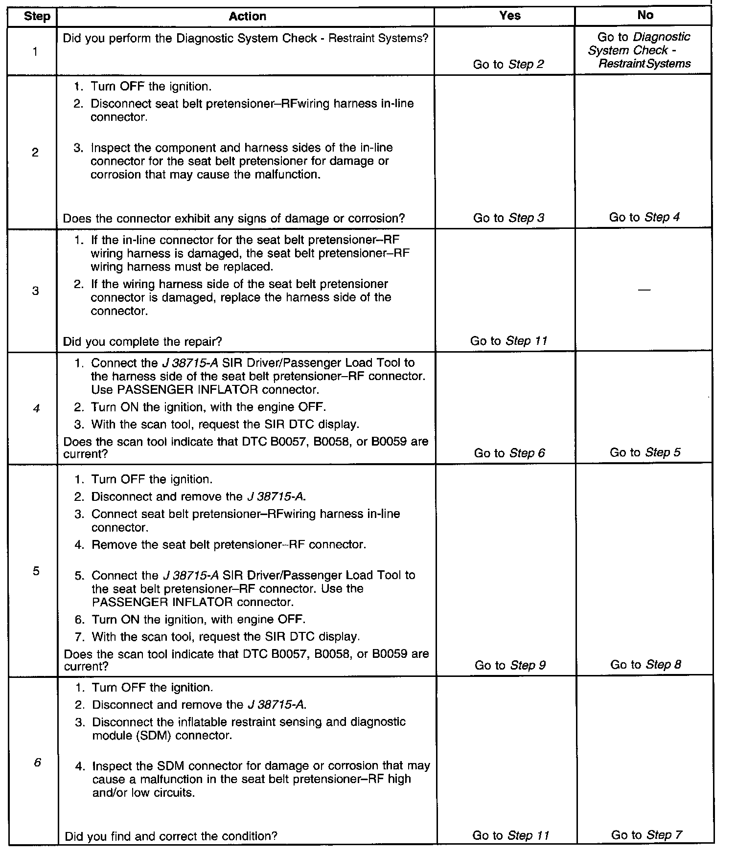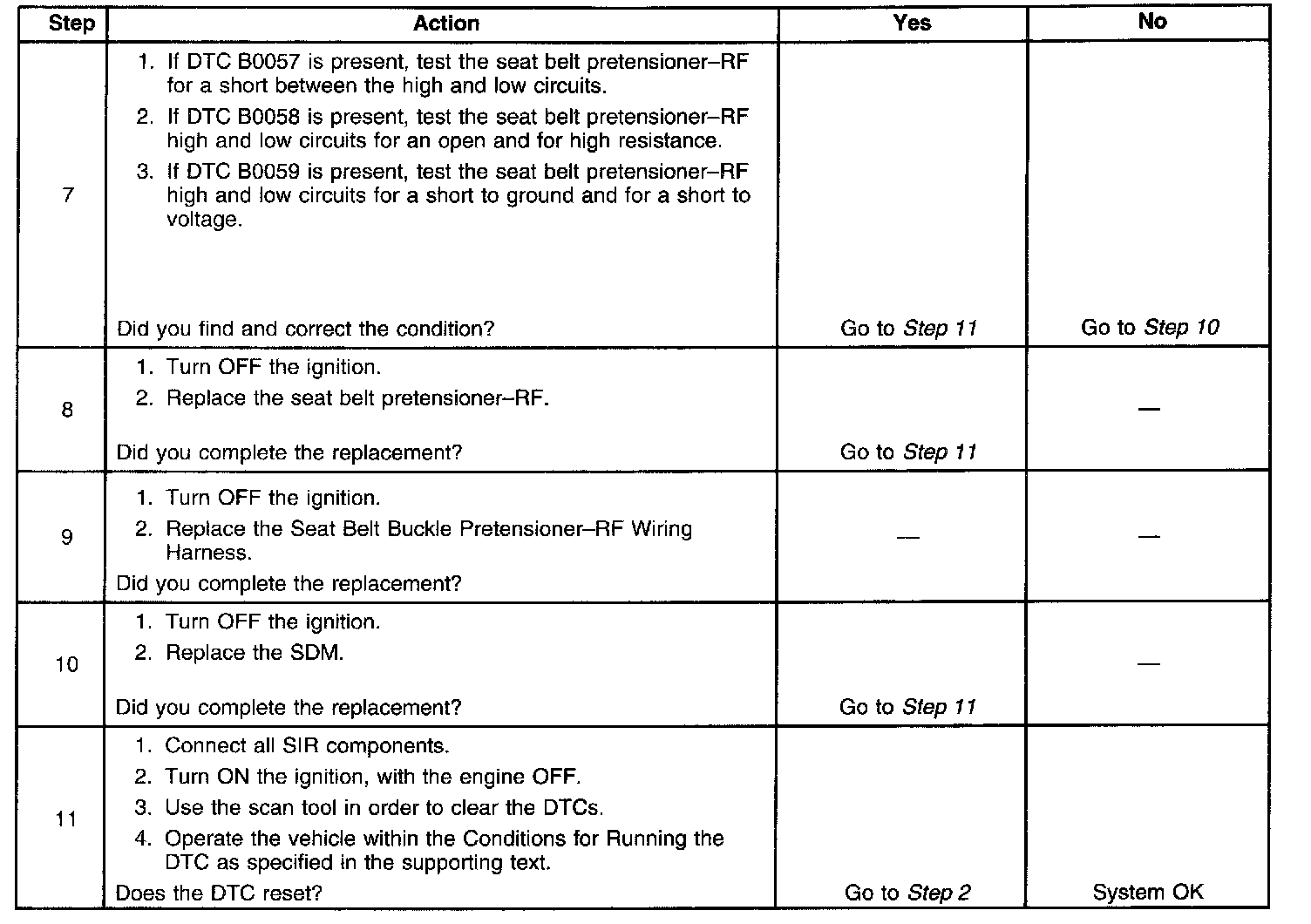 6. Tests to see what DTCs are present. If DTC B0057 is present, test the seat belt pretensioner-RF for a short between high and low circuits. If DTC B0058 is present, test the seat belt pretensioner-RF high and low circuits for an open and for high resistance. If DTC B0059 is present, test the seat belt pretensioner-RF high and low circuits for a short to ground and for a short to voltage.