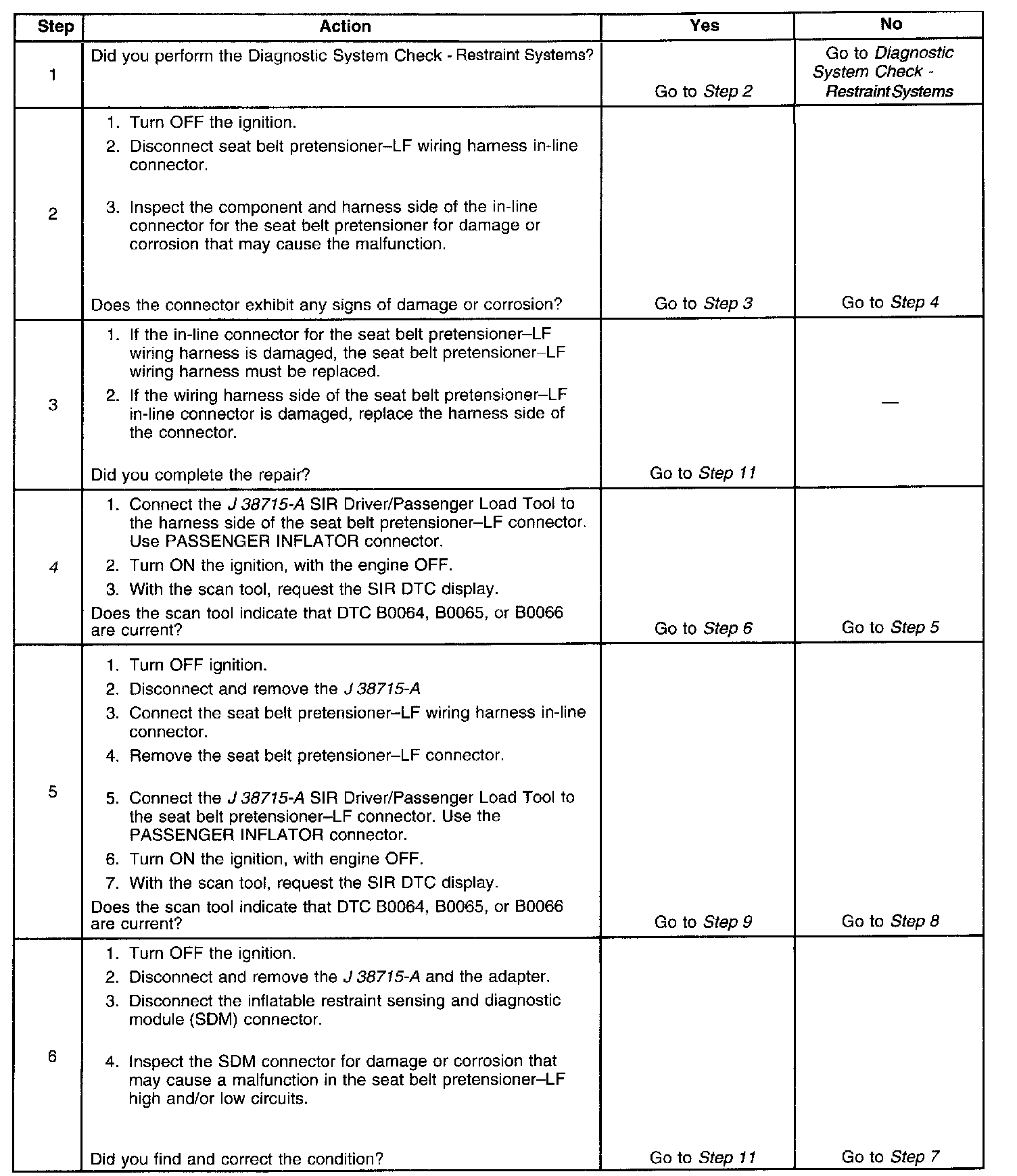 The driver seat belt pretensioner deployment loop consists of an seat belt pretensioner-LF, the seat belt pretensioner-LF high and seat belt pretensioner-LF low circuits. A shorting bar used within the seat belt pretensioner connector which will short together both seat belt pretensioner high and low circuits when the connector is disconnected, this will help to prevent unwanted deployment of the pretensioner during servicing. During a frontal crash of sufficient force the inflatable restraint sensing and diagnostic module (SDM) will allow current to flow through the deployment loop in order to deploy the seat belt pretensioner. The SDM performs continuous diagnostic tests on the deployment loops to check for proper circuit continuity and for shorts to ground or voltage. If a malfunction is detected, a diagnostic trouble code (DTC) will be stored in memory.
