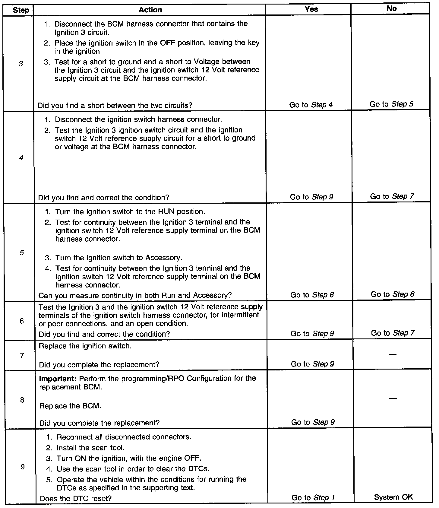 3. This tests the ignition switch for a short circuit between the 12 Volt reference supply circuit and the Ignition 3 circuit in the Off position.