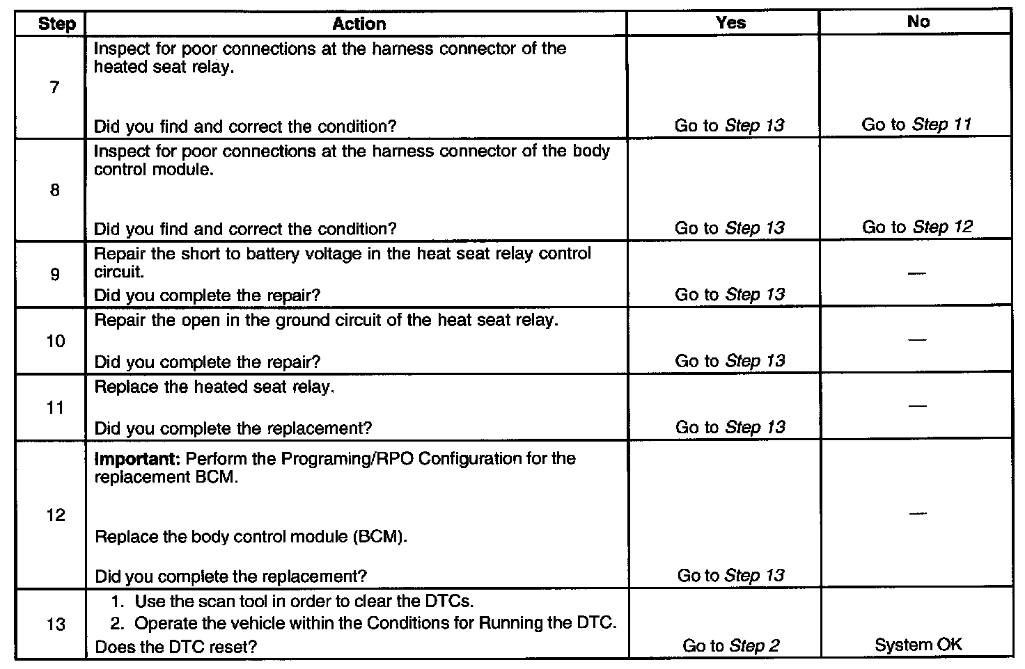 When the heated seat system is activated, the body control module (BCM) controls the heated seat operation through the heated seat relay control circuit and the heated seat relay. The relay then energizes supplying battery positive voltage to the seat heater elements. The circuit that generated this diagnostic trouble code (DTC) is the heated seat relay control circuit that is wired between the BCM and the heated seat relay. The BCM monitors the voltage of this circuit during heated seat operation.