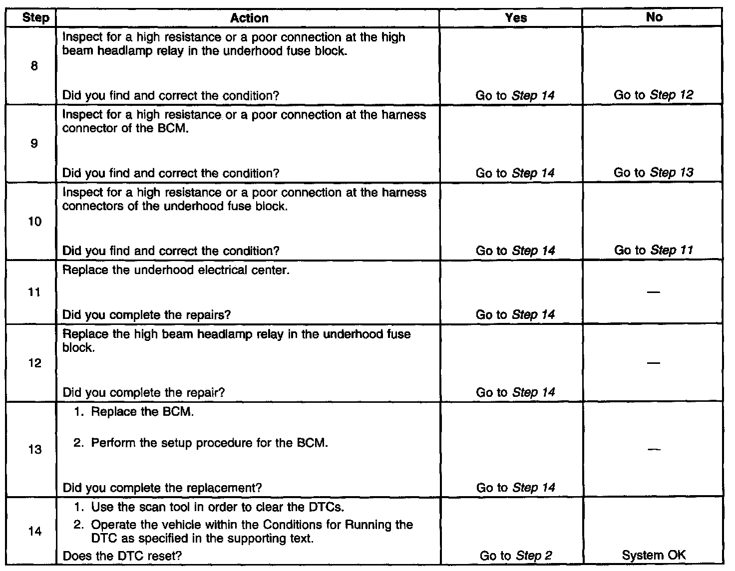 - When the BCM receives a high beam headlamp ON command and the high beam headlamp relay control circuit is shorted to voltage or open.