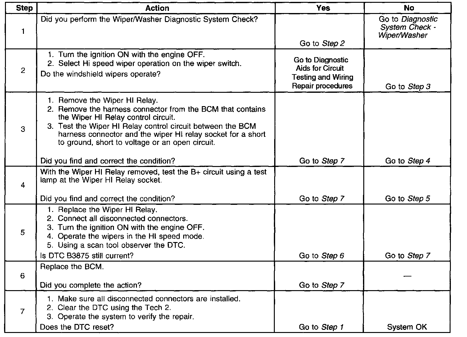 The body control module, (BCM) controls and monitors the state of the Wiper HI Relay control circuit. The wiper hi relay is used to control the hi speed wiper function. The BCM supplies a negative voltage to the relay. The relay is supplied B+ from the WIPER/WS fuse. The voltage level from the BCM should be high while the relay is inactive. The voltage should be near ground when the BCM commands the relay ON.