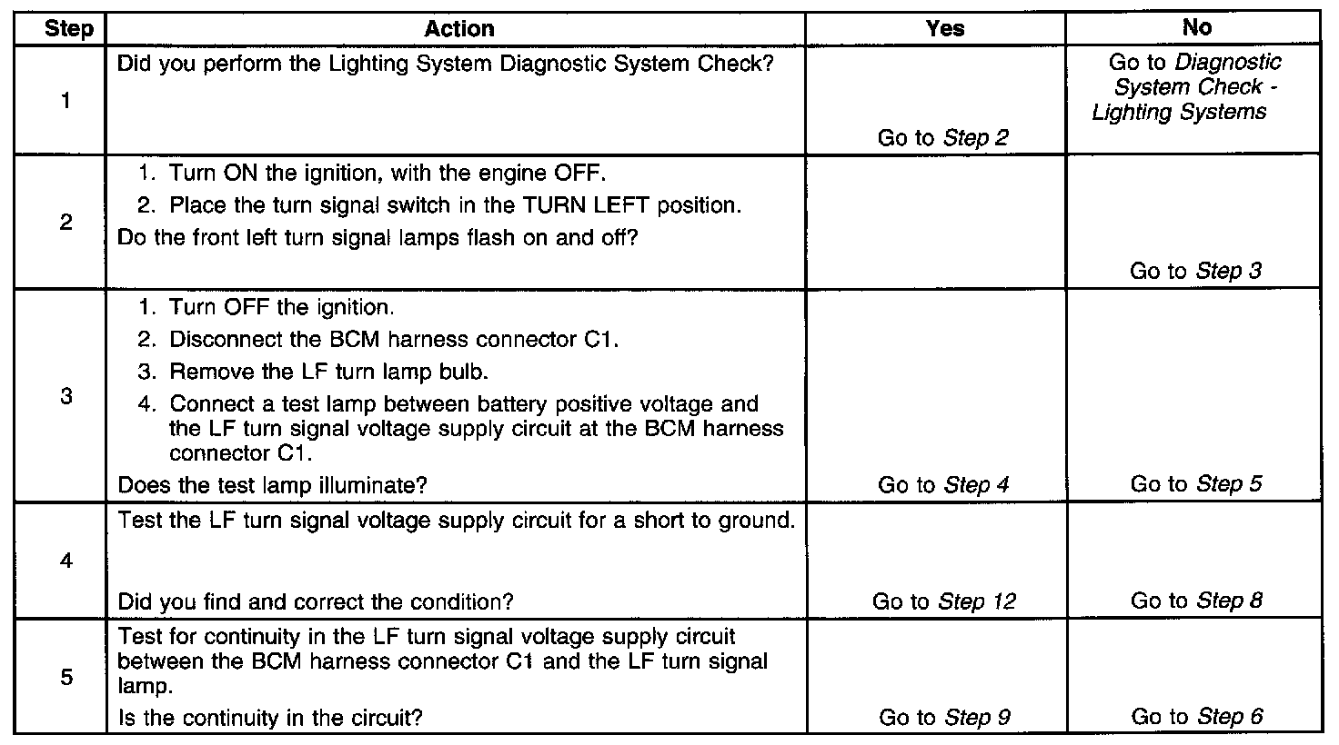 Ground is applied to the turn signal switch. When the turn signal switch is placed in the turn left position, ground is applied to the body control module (BCM) through the left turn signal switch circuit. The BCM then applies a pulsating voltage to the LF and LR turn signal lamps through the LF and LR turn signal voltage supply circuits.