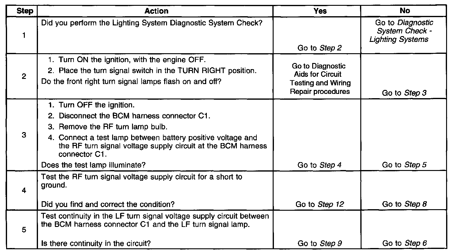Ground is applied to the turn signal switch. When the turn signal switch is placed in the turn right position, ground is applied to the body control module (BCM) through the right turn signal switch circuit. The BCM applies a pulsating voltage to the RF and RR turn signal lamps through the RF and RR turn signal voltage supply circuits.