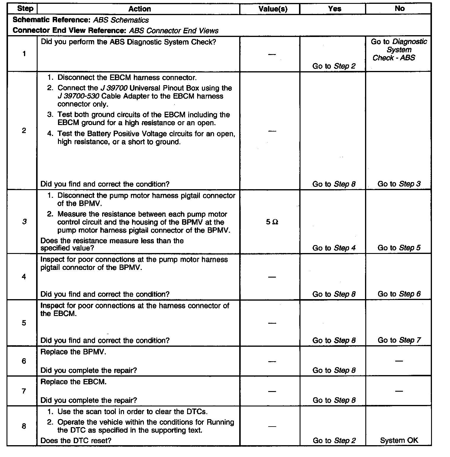 3. Tests the pump motor circuits of the BPMV for a short to the housing of the BPMV. The wiring from the BPMV to the EBCM should not be repaired.