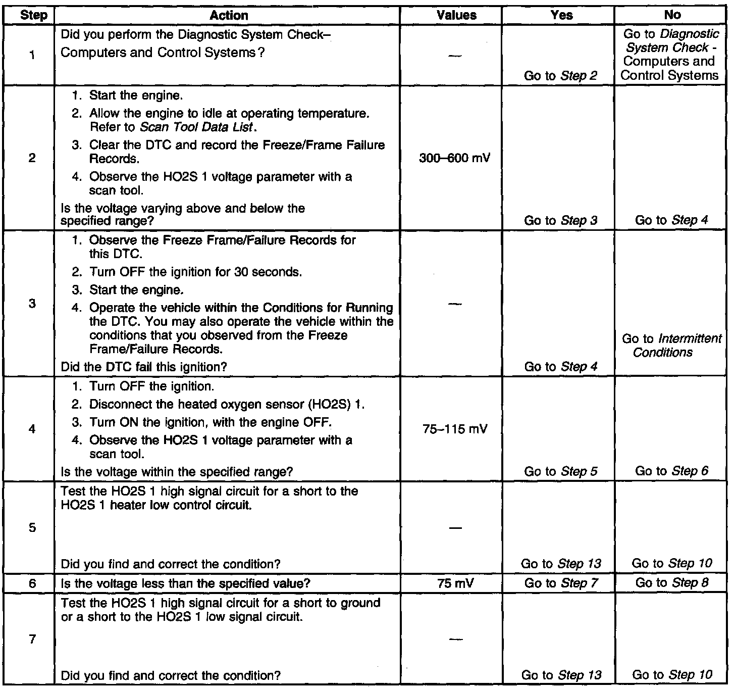 The PCM detects that the HO2S 1 voltage is less than 78 mV for more than 51 seconds.