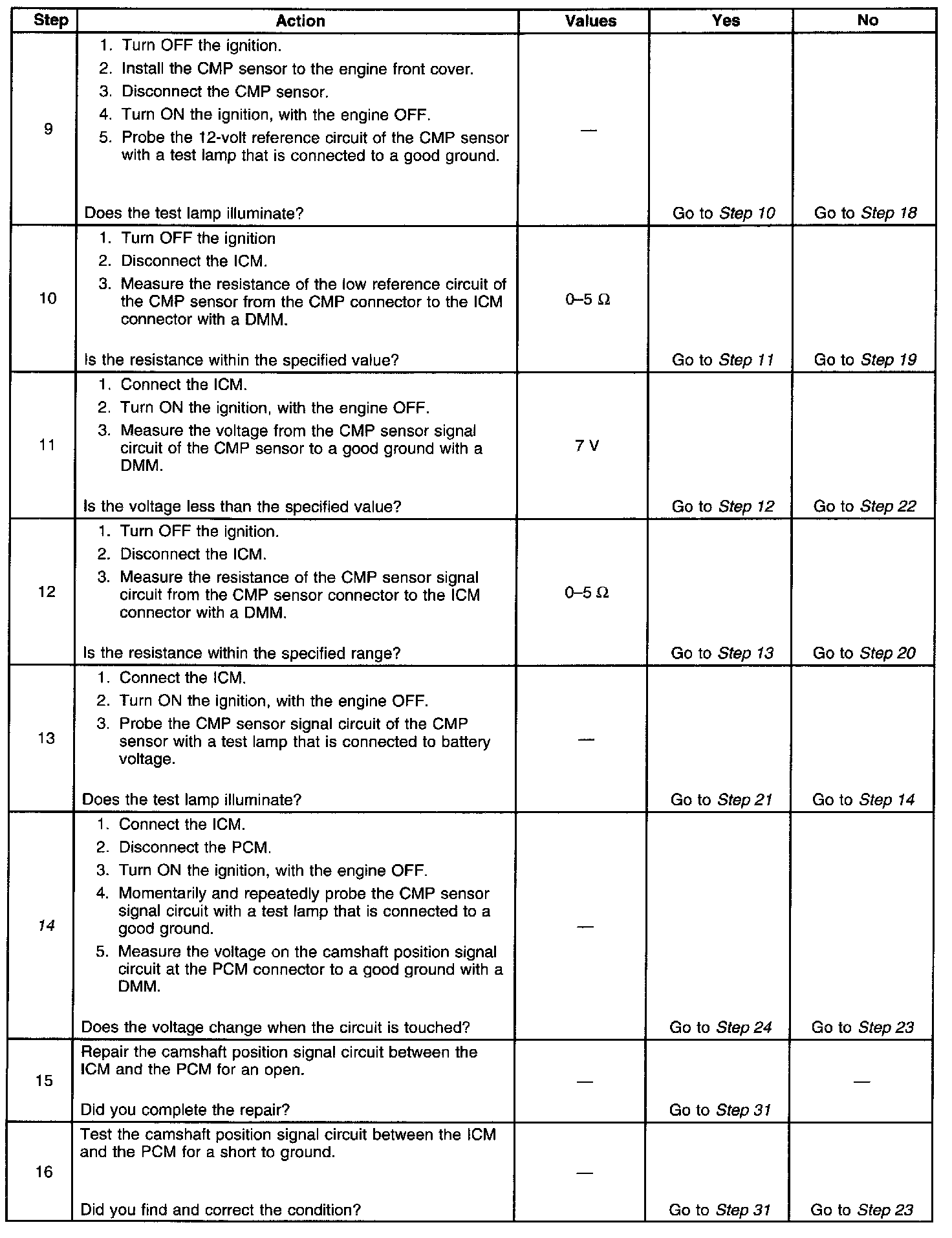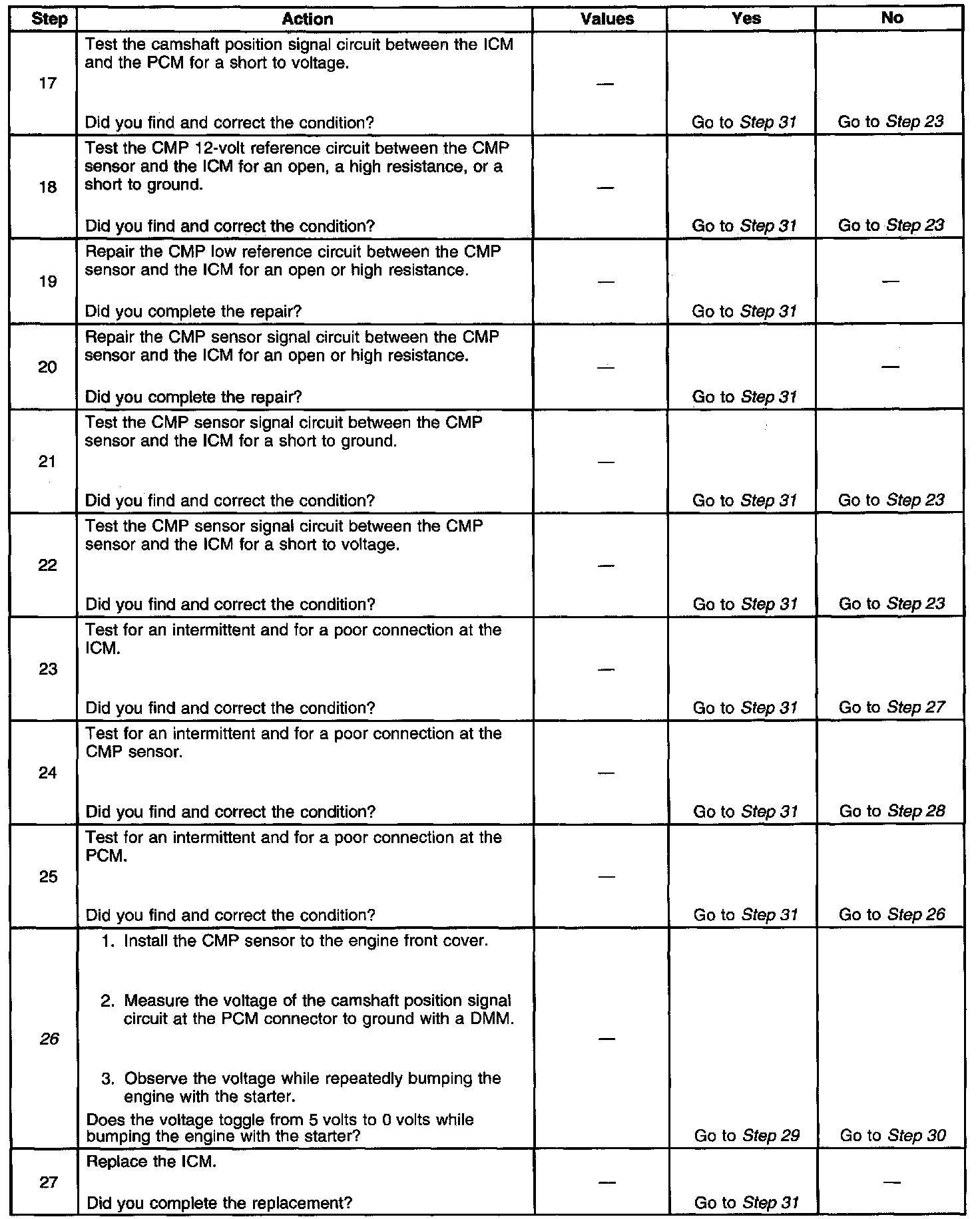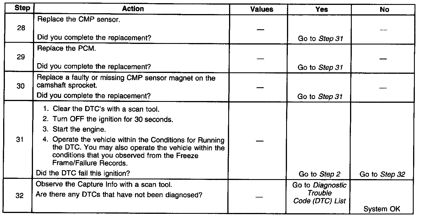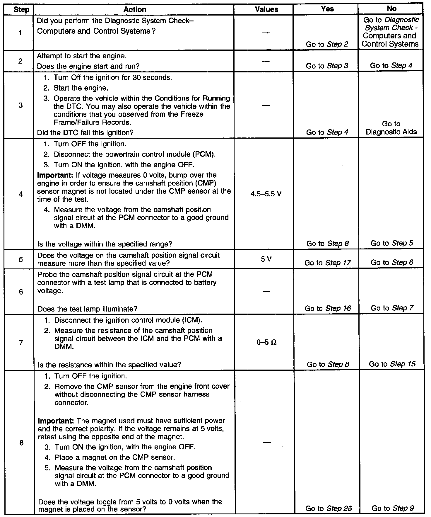 26. This step determines if the fault is caused by a missing camshaft magnet or by a faulty PCM. The voltage measured in this step should be near 5 volts, and decrease to near 0 volts when the CMP sensor interfaces with the camshaft magnet.