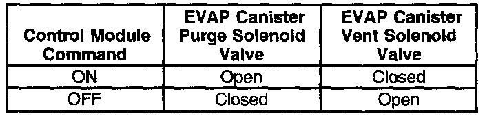The table illustrates the relationship between the ON and OFF states, and the Open or Closed states of the EVAP canister purge and vent solenoid valves.