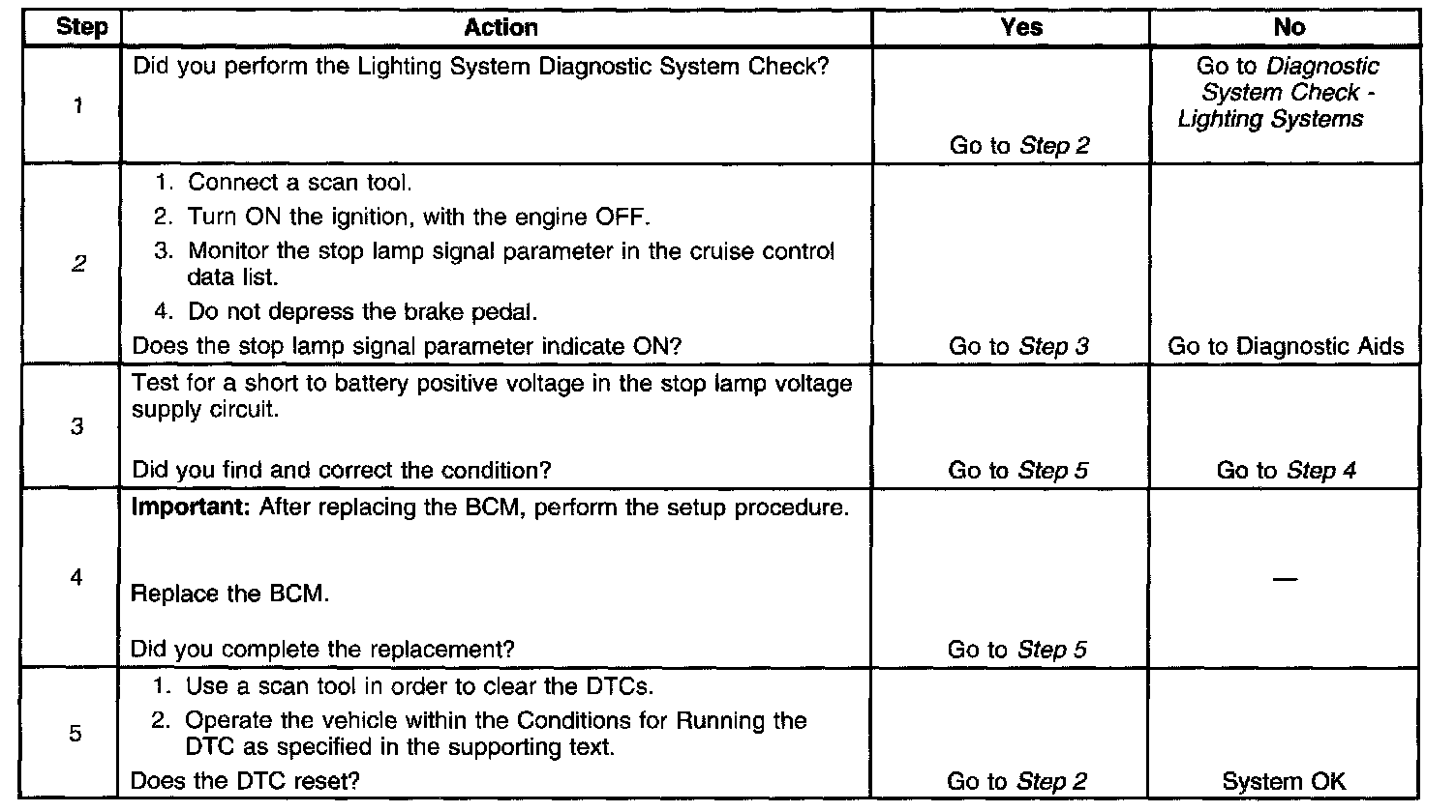 The BCM receives a signal from the brake pedal position sensor through the stop lamp switch signal circuit. The BCM then applies voltage through the stop lamp voltage supply circuit to the PCM, EBCM and the stop lamps.