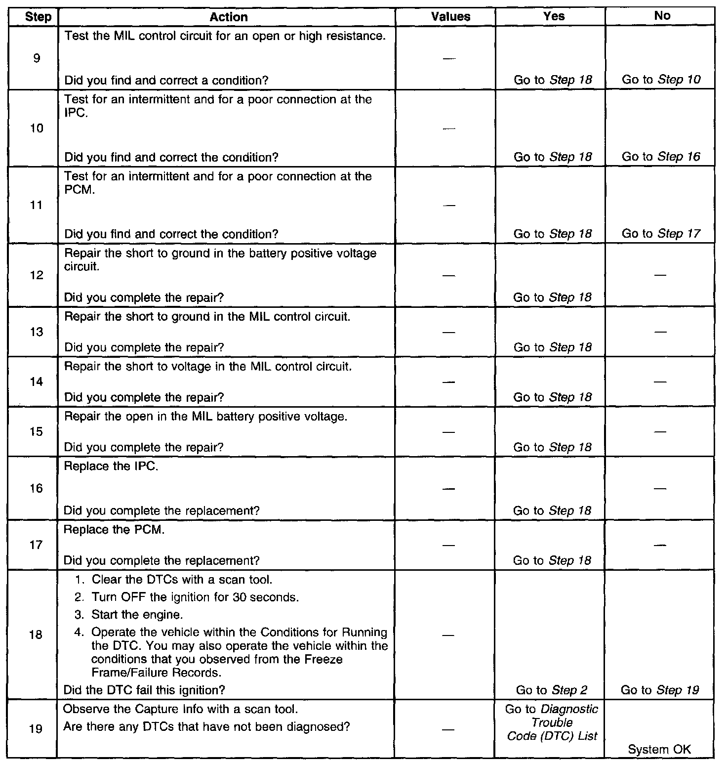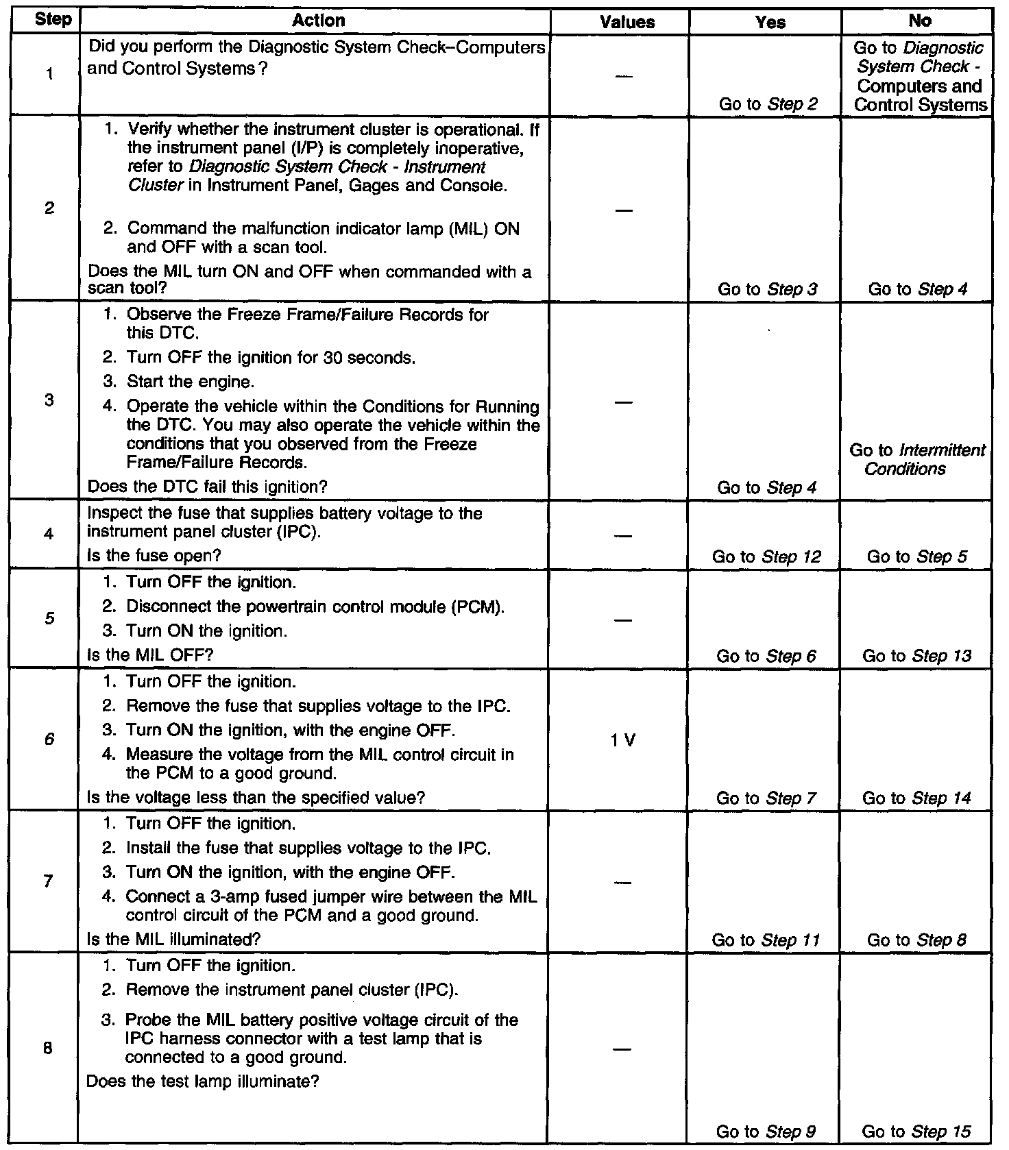 5. This step tests for a short to ground in the MIL control circuit. With the powertrain control module (PCM) disconnected and the ignition ON, the MIL should be OFF.