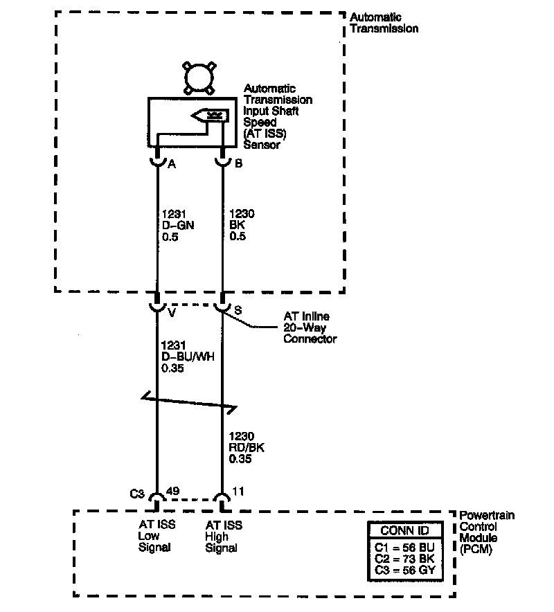 There is a fixed air gap between the sensor and the teeth on the sensor reluctor wheel. The AT ISS sensor input is used by the PCM in order to control line pressure, TCC apply and release and transmission shift patterns. This sensor is also used to calculate the appropriate gear ratios and TCC slippage.
