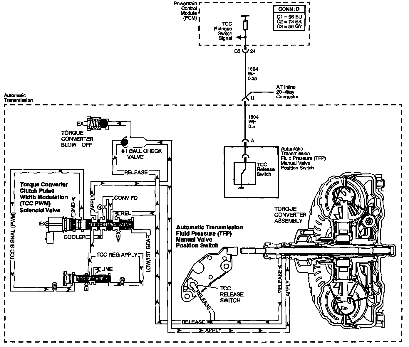 The TCC release switch is a normally-closed switch. When the TCC is released, TCC release fluid pressure opens the TCC release switch which opens the TCC release pressure circuit. When the voltage on the circuit is high, switch open, the PCM recognizes that the TCC is no longer engaged.