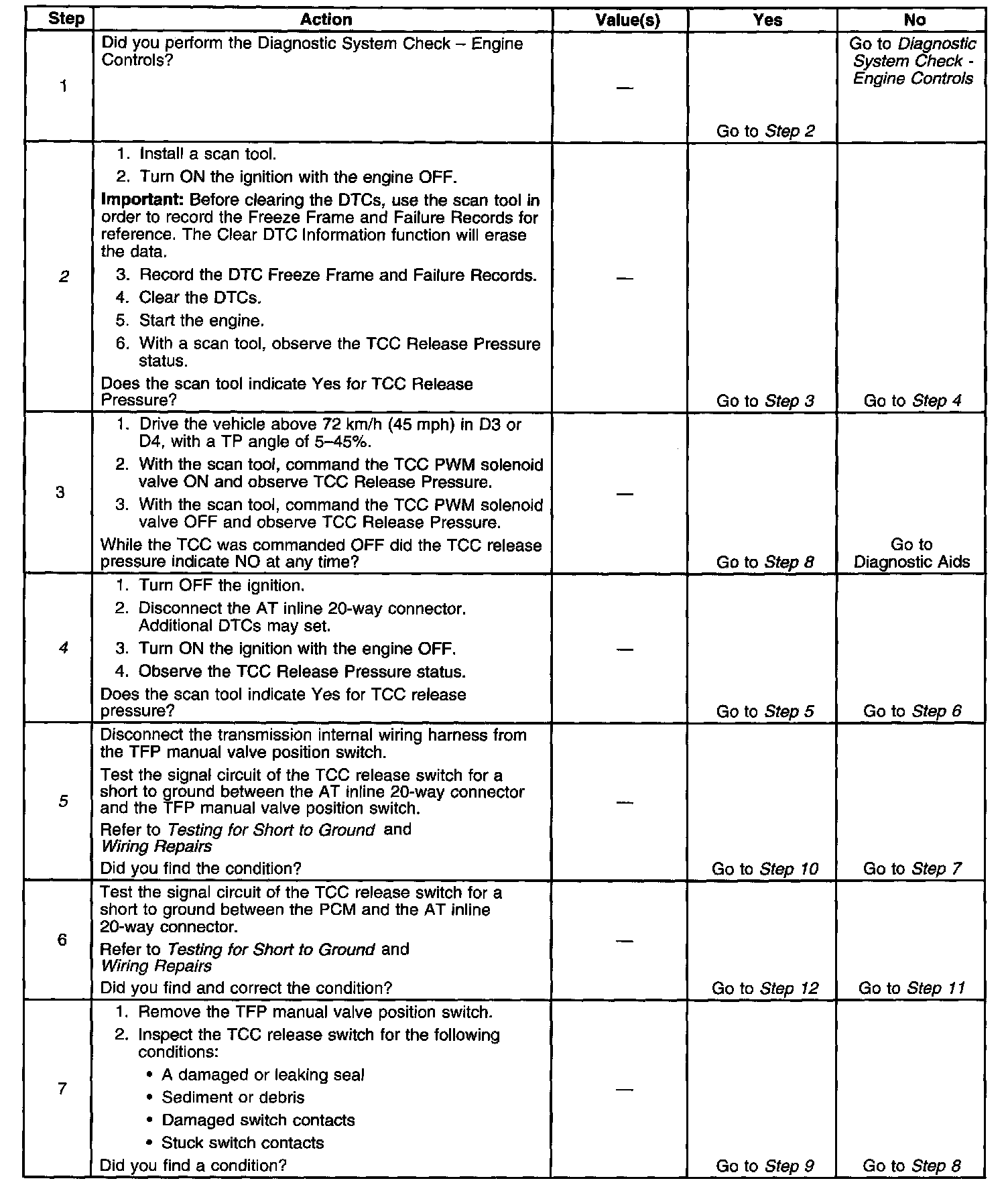 - If the scan tool indicated TCC release pressure was present in Step 2 and a mechanical or hydraulic condition was not found in Step 8, an intermittent short to ground condition may exist in the TCC release switch signal circuit.