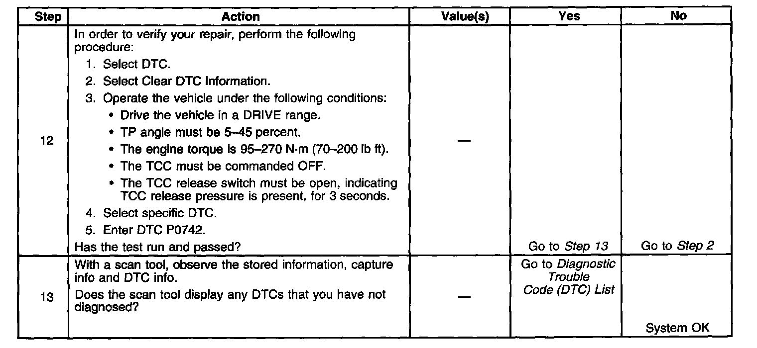 If the PCM detects that the TCC release switch is closed when the TCC is commanded OFF, then DTC P0742 sets. DTC P0742 is a type B DTC.