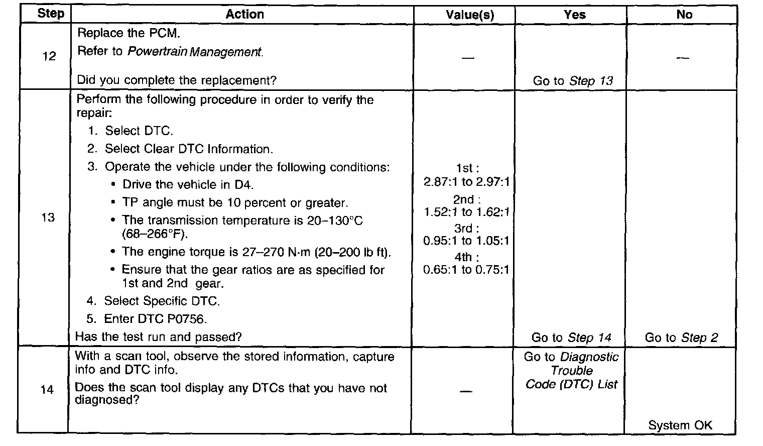 If the PCM detects a 4th gear ratio when 1st gear is commanded and a 3rd gear ratio when 2nd gear is commanded, then DTC P0756 sets. DTC P0756 is a type A DTC.