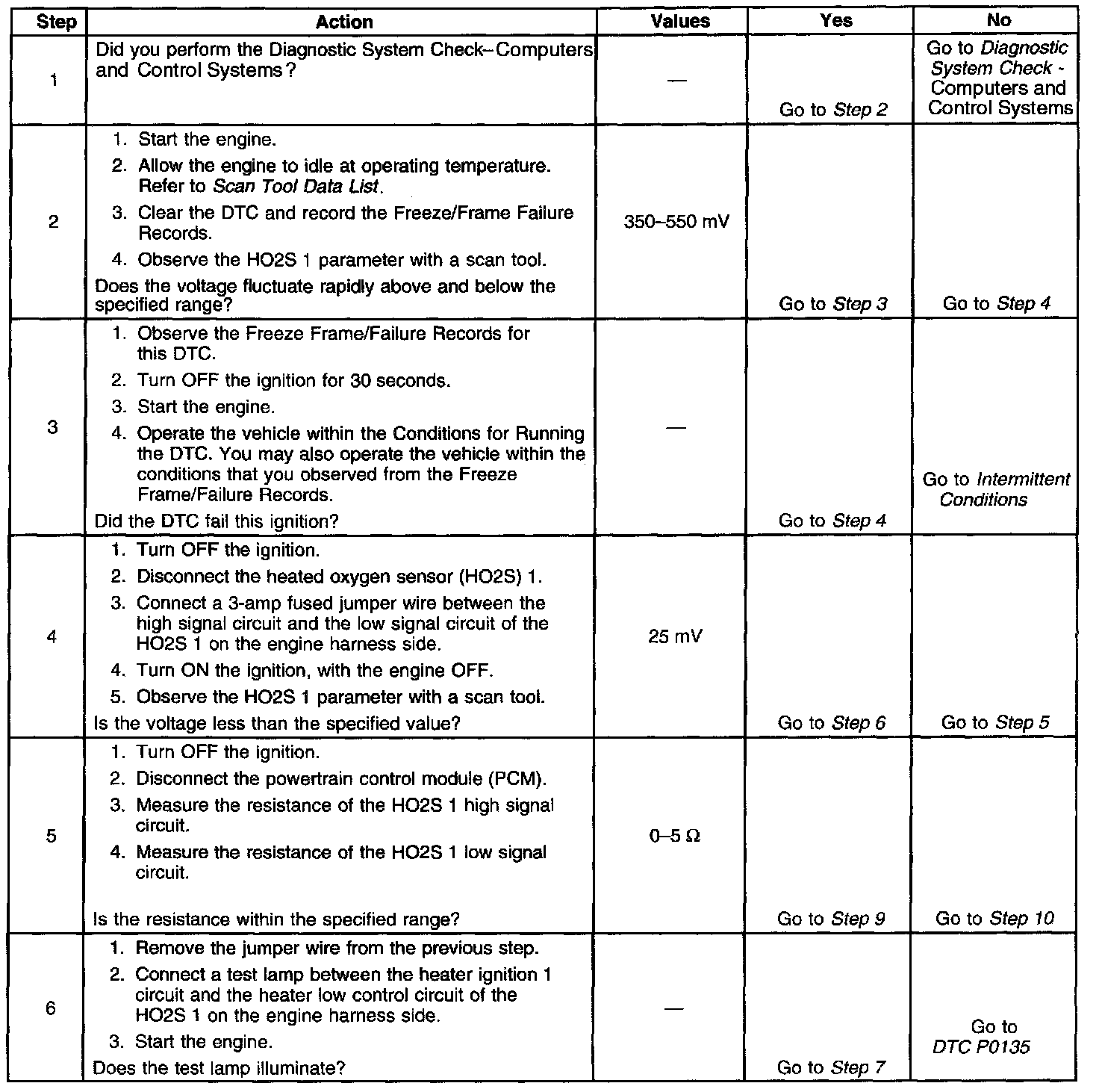 Heated oxygen sensors (HO2S) are used for fuel control and post catalyst monitoring. Each HO2S compares the oxygen content of the surrounding air with the oxygen content of the exhaust stream. When the vehicle is first started, the powertrain control module (PCM) operates in an Open Loop mode, ignoring the HO2S signal voltage when calculating the air-to-fuel ratio. The PCM supplies the HO2S with a reference or bias voltage of about 450 mV. The HO2S generates a voltage within a range of 0-1,00O mV that fluctuates above and below bias voltage once the sensor reaches operating temperature. A high HO2S voltage output indicates a rich fuel mixture. A low HO2S voltage output indicates a lean mixture. Heating elements inside the HO2S minimize the time required for the sensors to reach operating temperature and provide an accurate voltage signal. This DTC runs once per ignition cycle. If the PCM detects that the HO2S 1 voltage did not switch enough times during a calibrated time period, DTC P1133 will set.