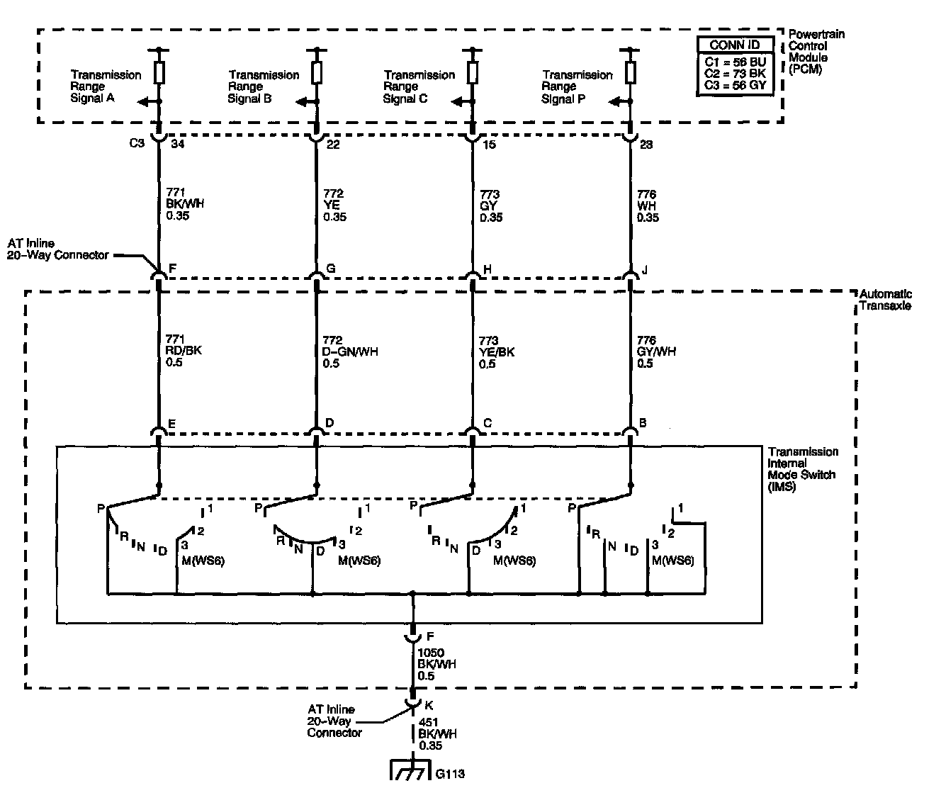 The transmission Internal Mode Switch (IMS) is a sliding contact switch attached to the selector detent inside the transmission side cover. The four inputs to the PCM indicate the position of the transmission range selector. The input voltage level at the PCM is high, B+, when the IMS is open and low when the switch is closed to ground. The four input parameters represented are Signals A, B, C and P - Parity. Refer to Transmission Internal Mode Switch Logic.