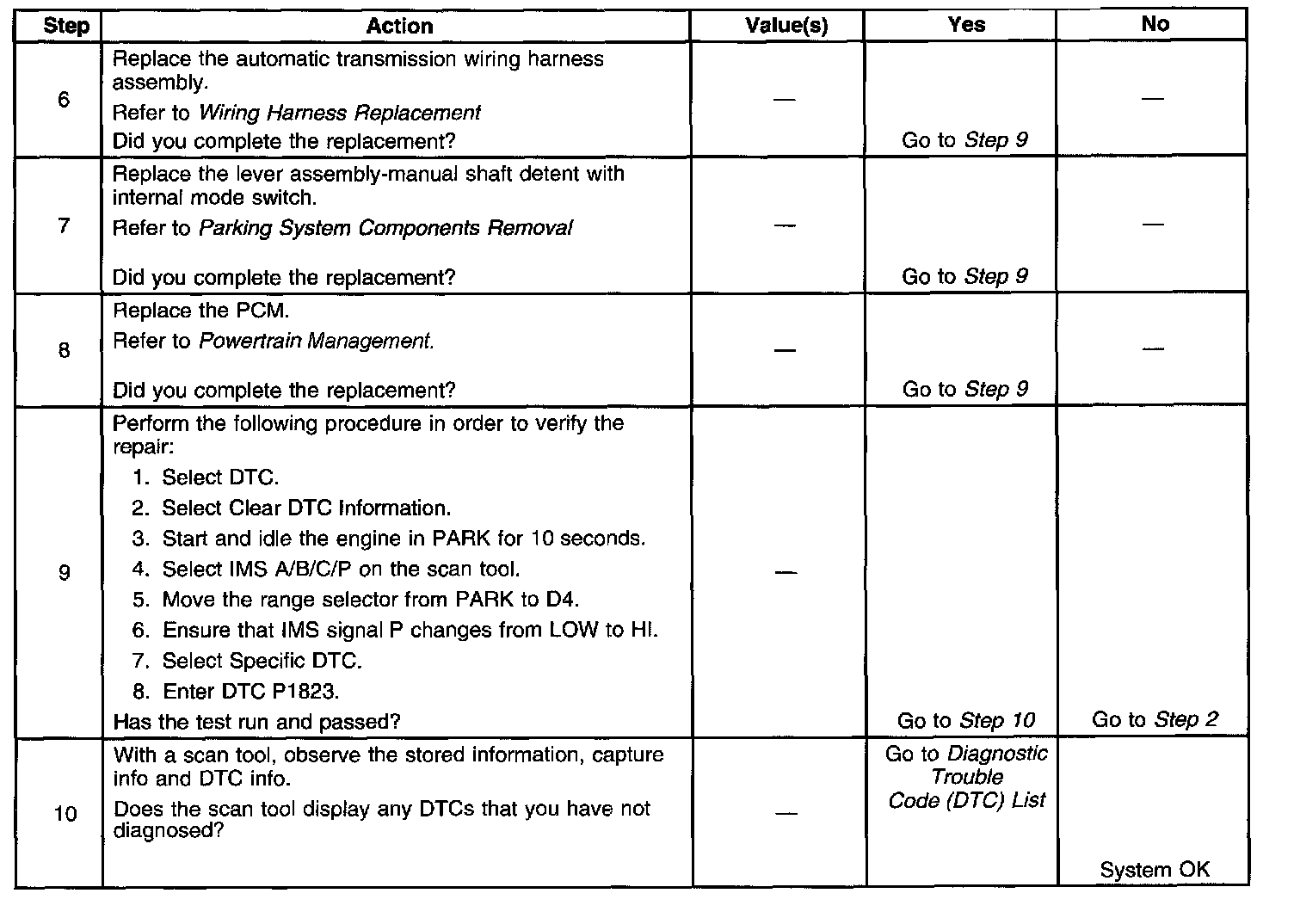 If the PCM detects that IMS Signal P is always low, then DTC P1823 sets. DTC P1823 is a type C DTC.