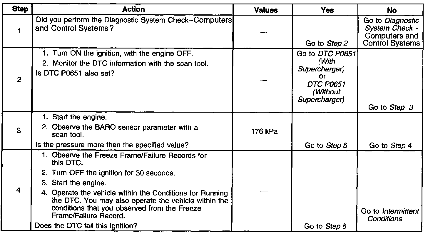 The barometric pressure (BARO) sensor is a transducer that varies resistance according to changes in altitude and atmospheric conditions. This gives the powertrain control module (PCM) an indication of the current barometric pressure. The PCM uses this information to calculate fuel delivery. The BARO sensor has a 5-volt reference circuit, a low reference circuit, and a signal circuit. The PCM supplies 5 volts to the BARO sensor on a 5-volt reference circuit, and provides a ground on a low reference circuit. The BARO sensor provides a voltage signal to the PCM on a signal circuit relative to the pressure changes. The PCM monitors the BARO sensor signal for voltage outside of the normal range. It the PCM detects a BARO sensor signal voltage that is excessively high, DTC P2229 sets.