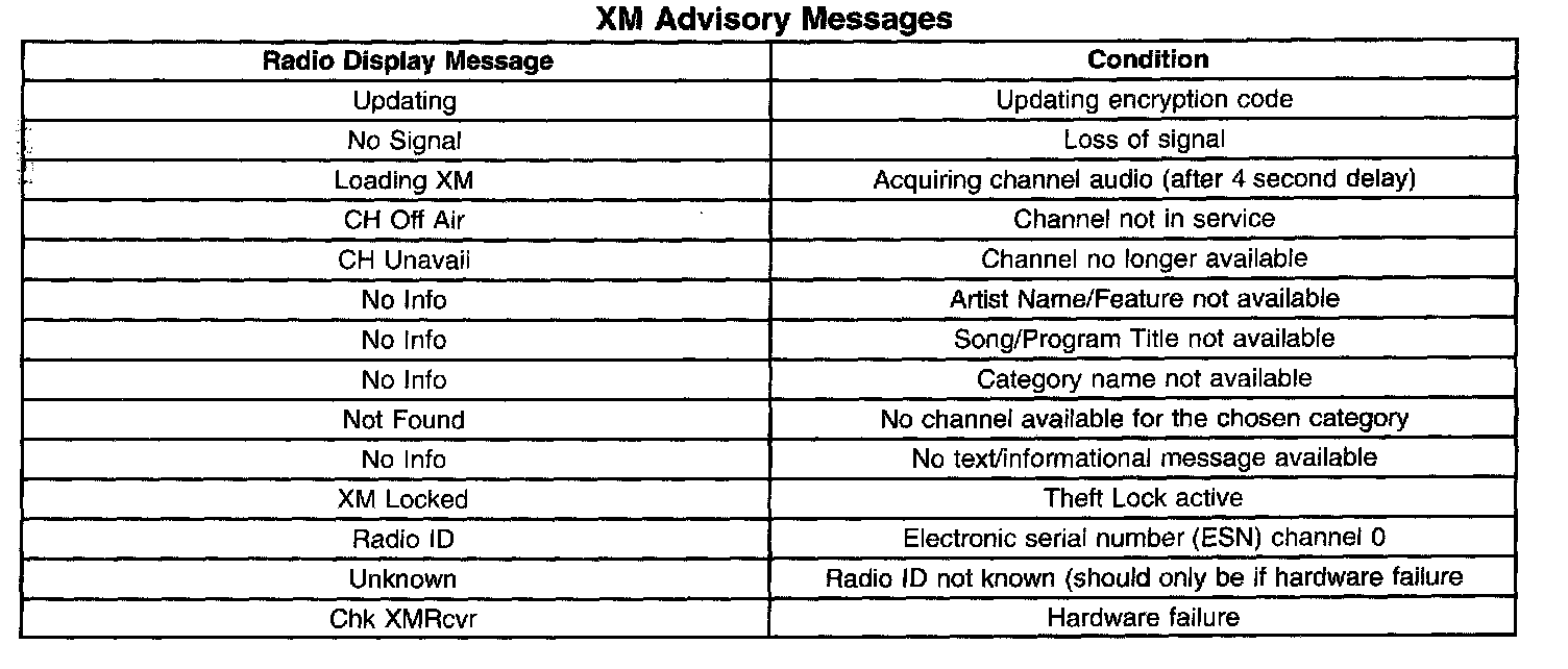 XM is a national satellite radio service that offers up to 100 coast to coast channels including music, news, sports, talk and children's programming. XM provides digital quality audio and text information, including song title and artist name. A service fee is required in order to receive the XM service. For more information, contact XM at www.xmradio.com or call 1-800-852-9696.